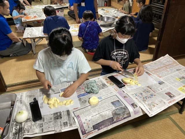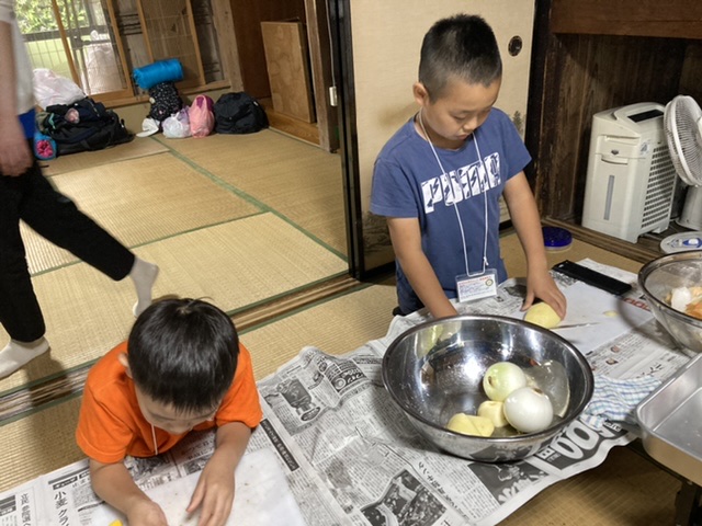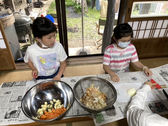 里山体験キャンプメンバーは夕食のカレー作りを始めました^ ^