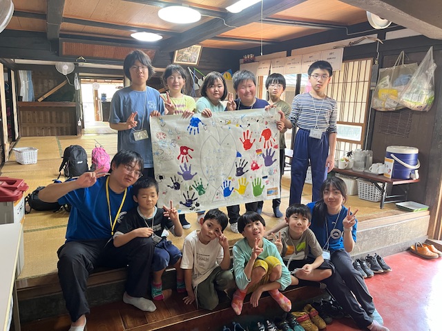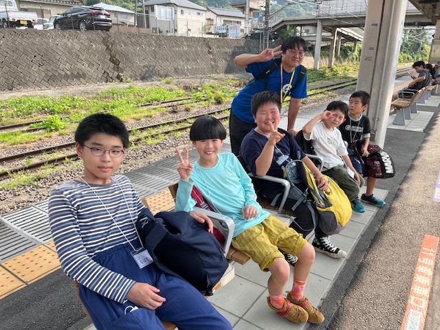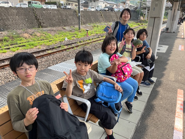 電車の中では別れを惜しみ、キャンプの思い出話をしています。