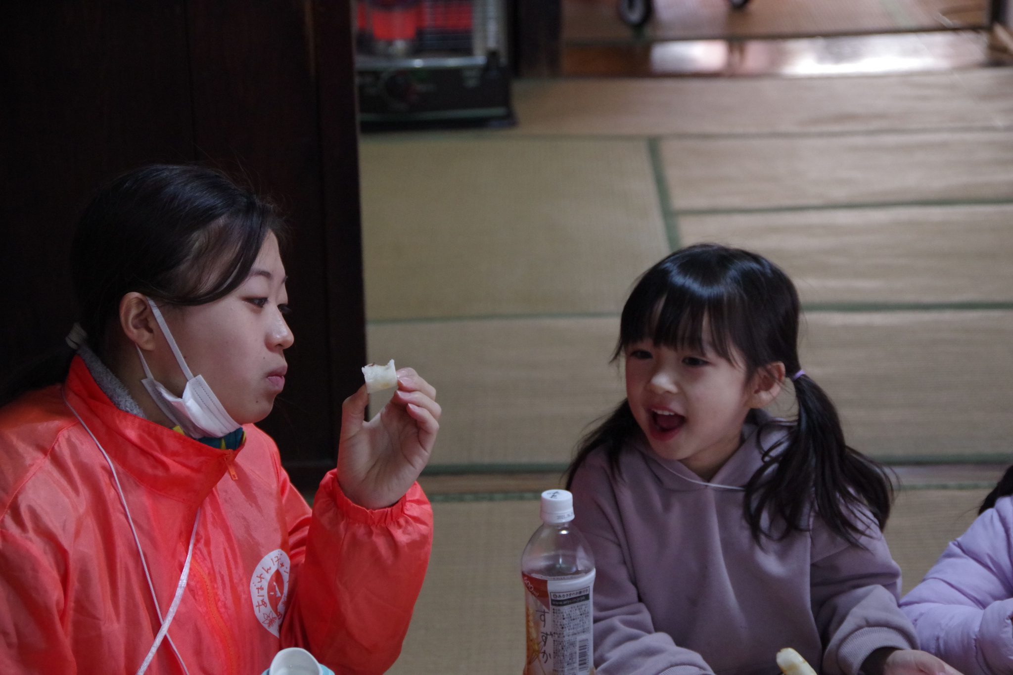 焼き立てのおもちは子どもたちにも大人気で、たくさん食べていました。