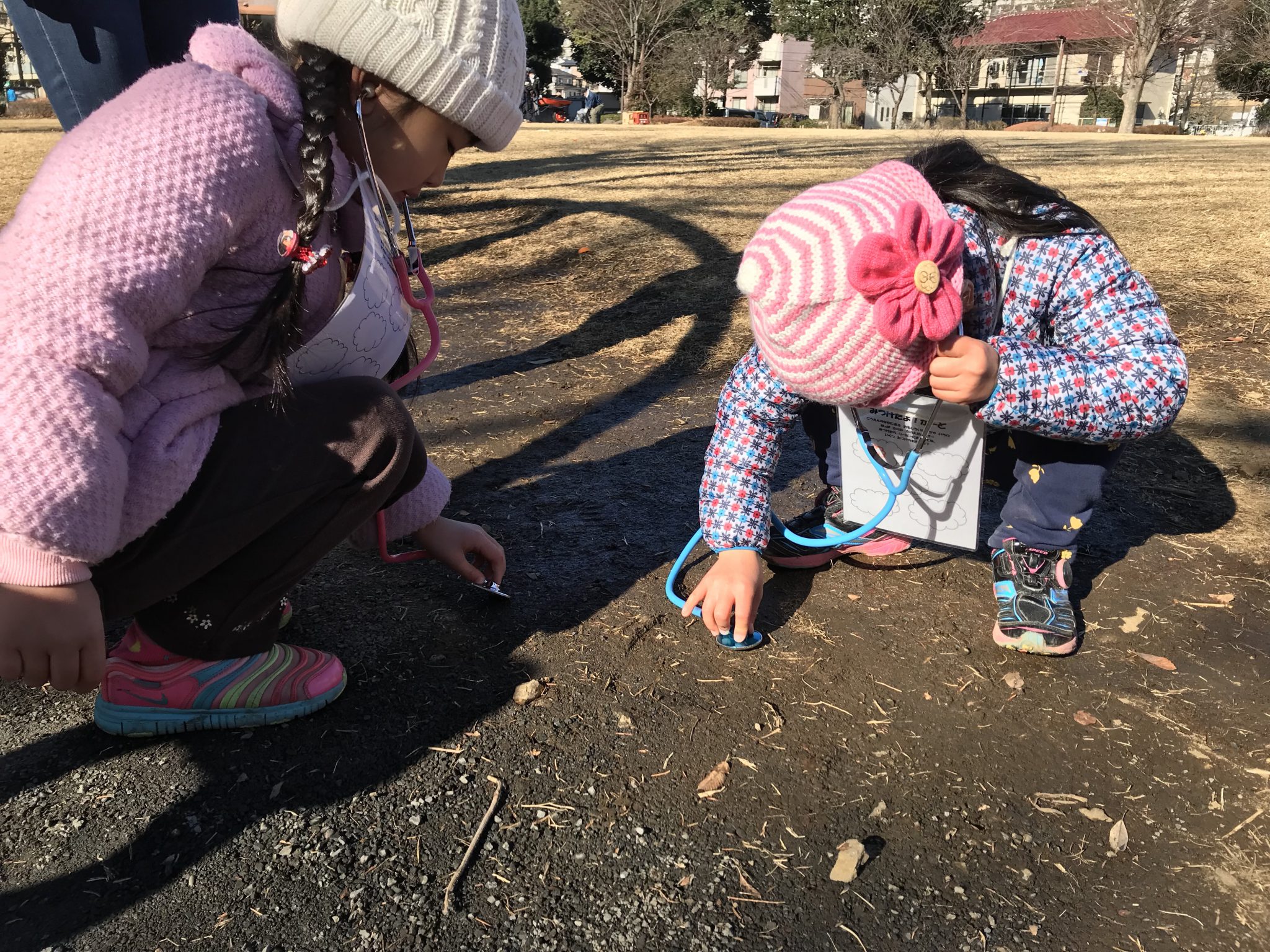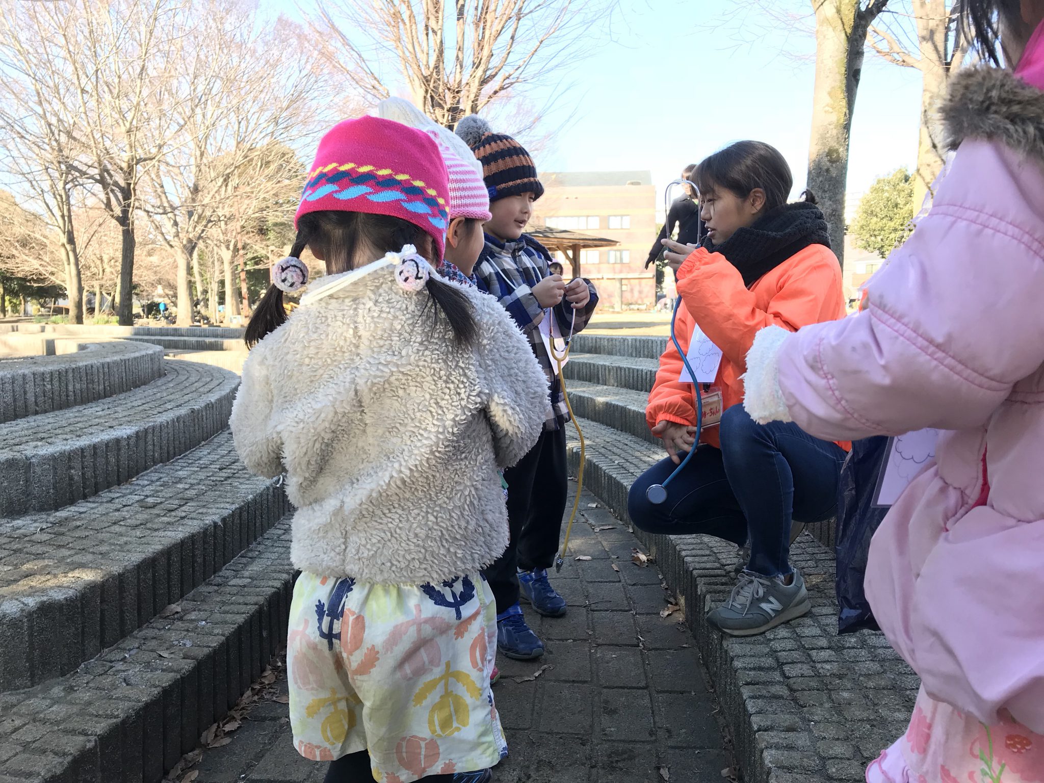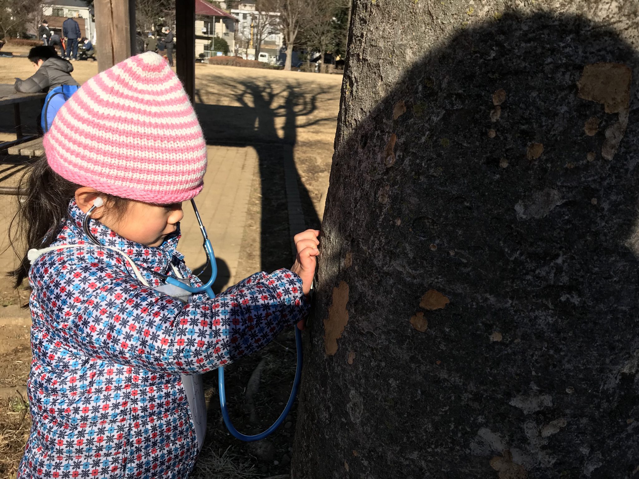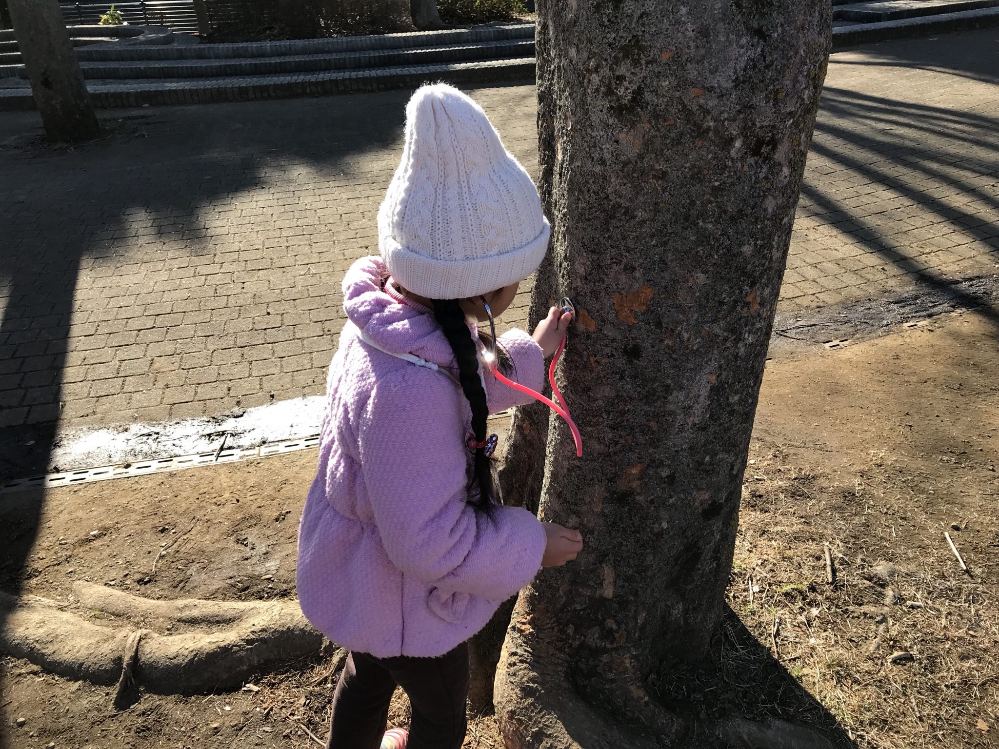 森のようちえんメンバーは公園に到着し、虫メガネと聴診器を使って公園の中を探検しています。 木の音、地面の音や池の氷、いろいろなものから発見があります。