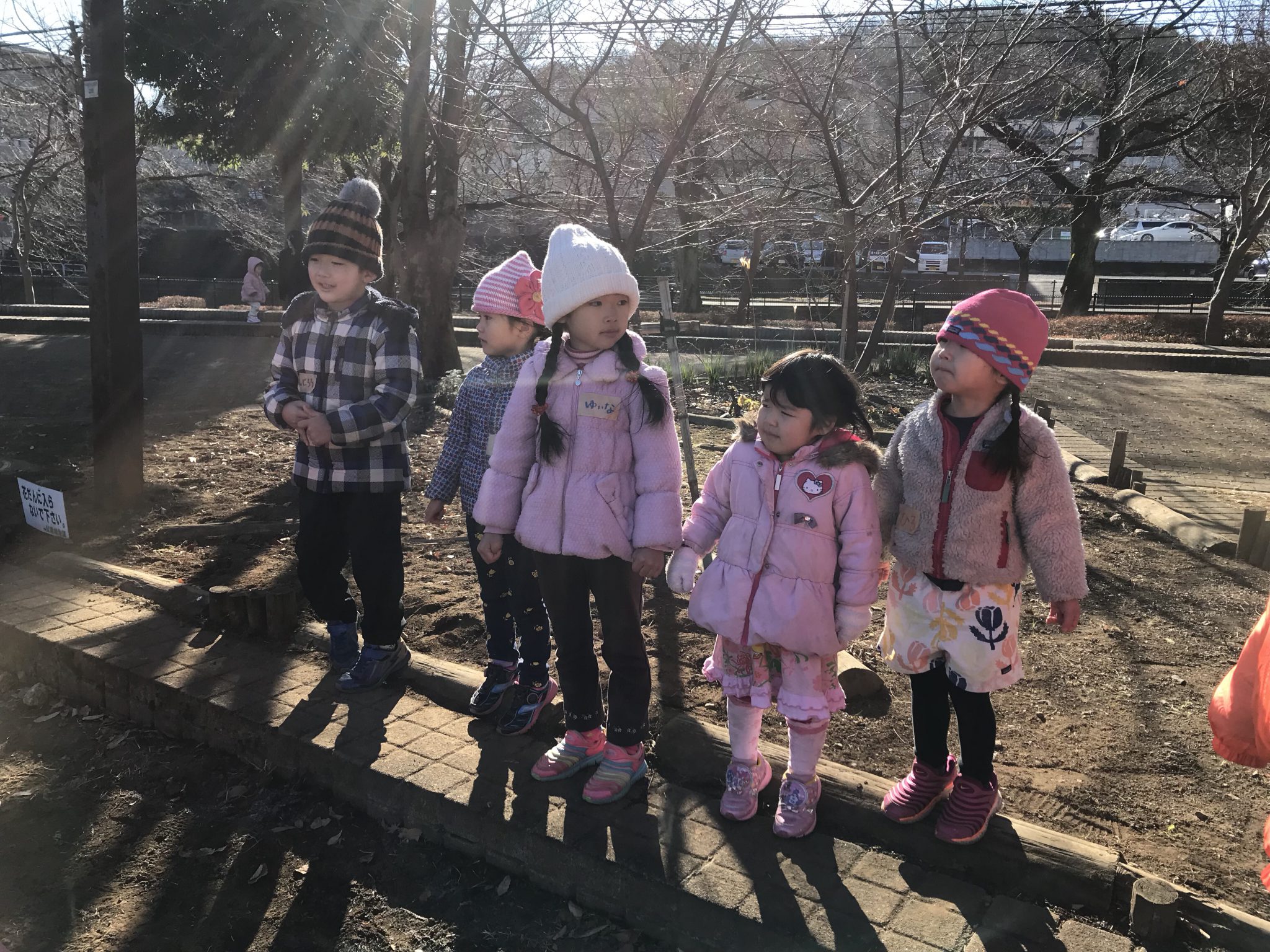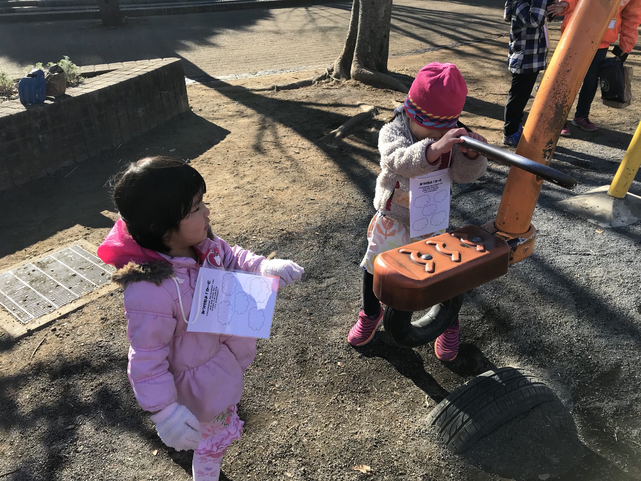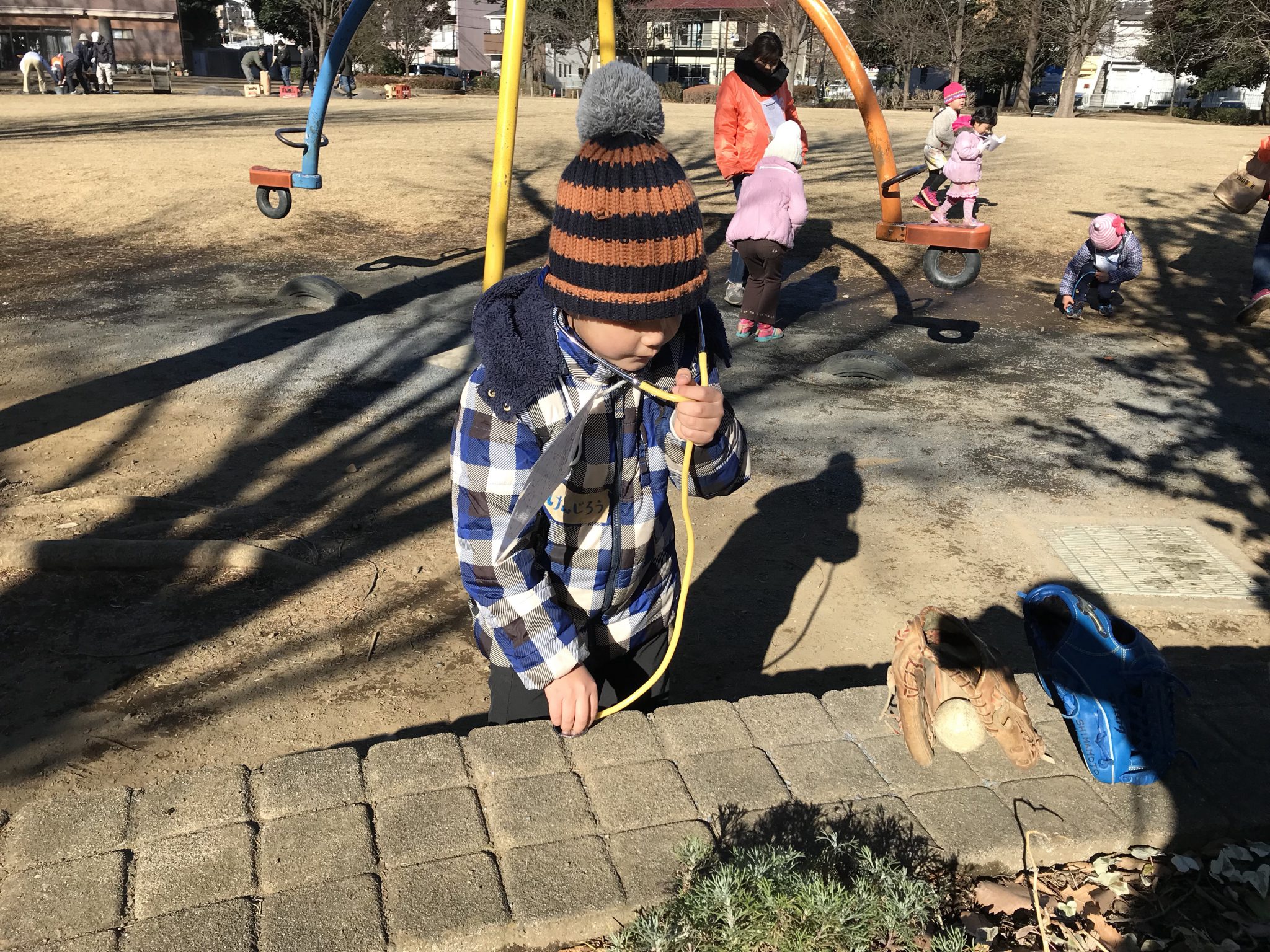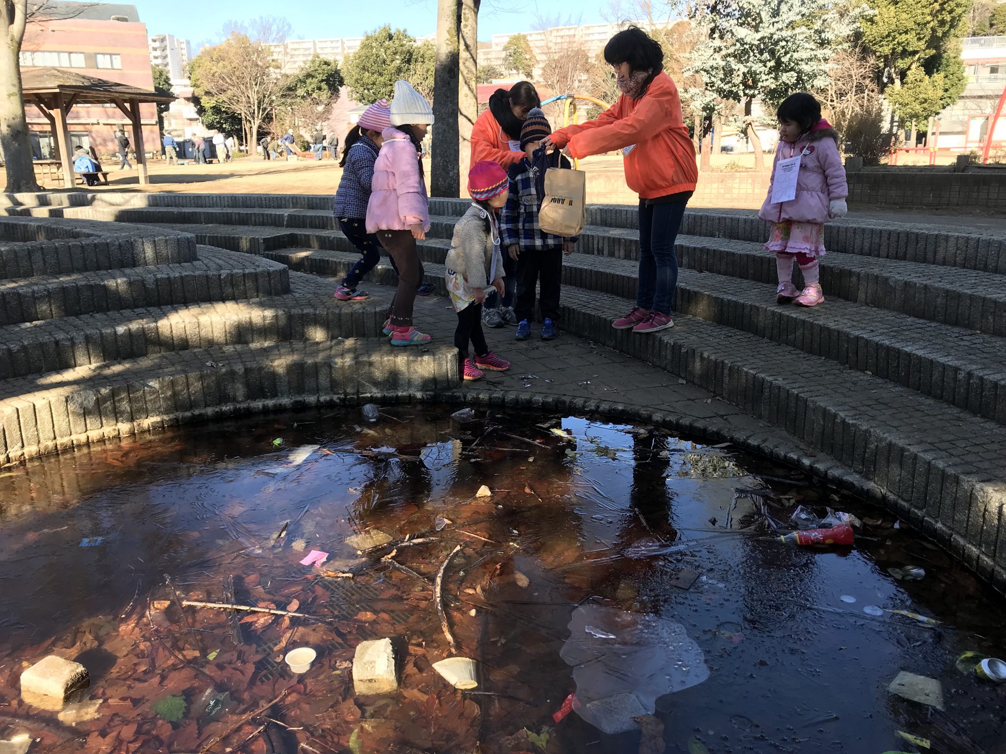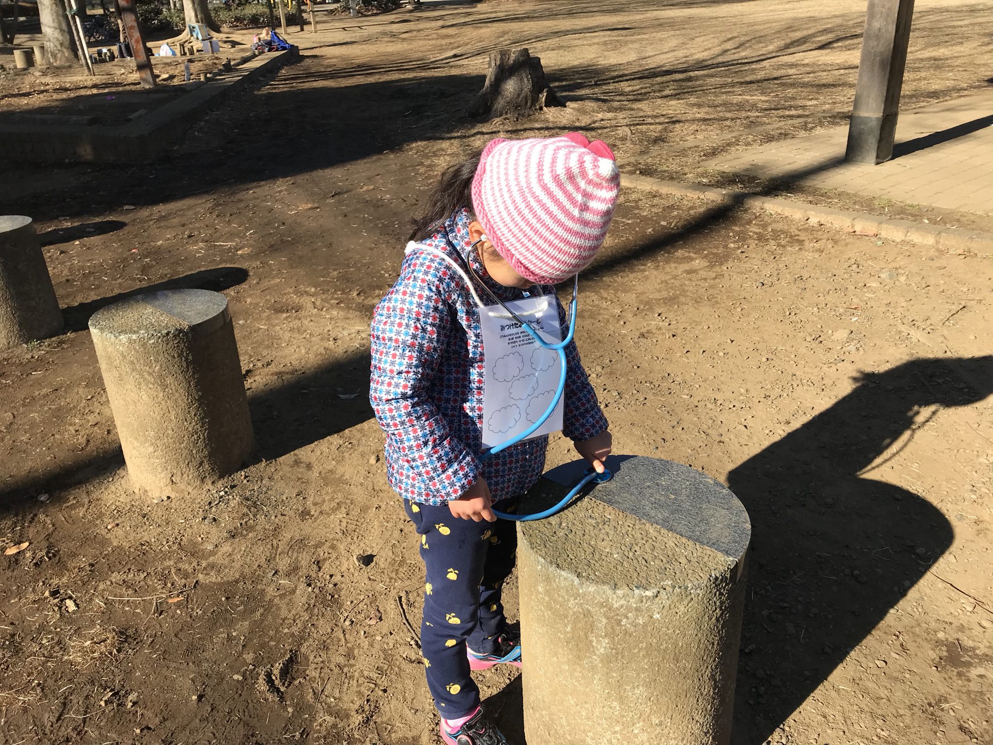 森のようちえんメンバーは公園に到着し、虫メガネと聴診器を使って公園の中を探検しています。 木の音、地面の音や池の氷、いろいろなものから発見があります。