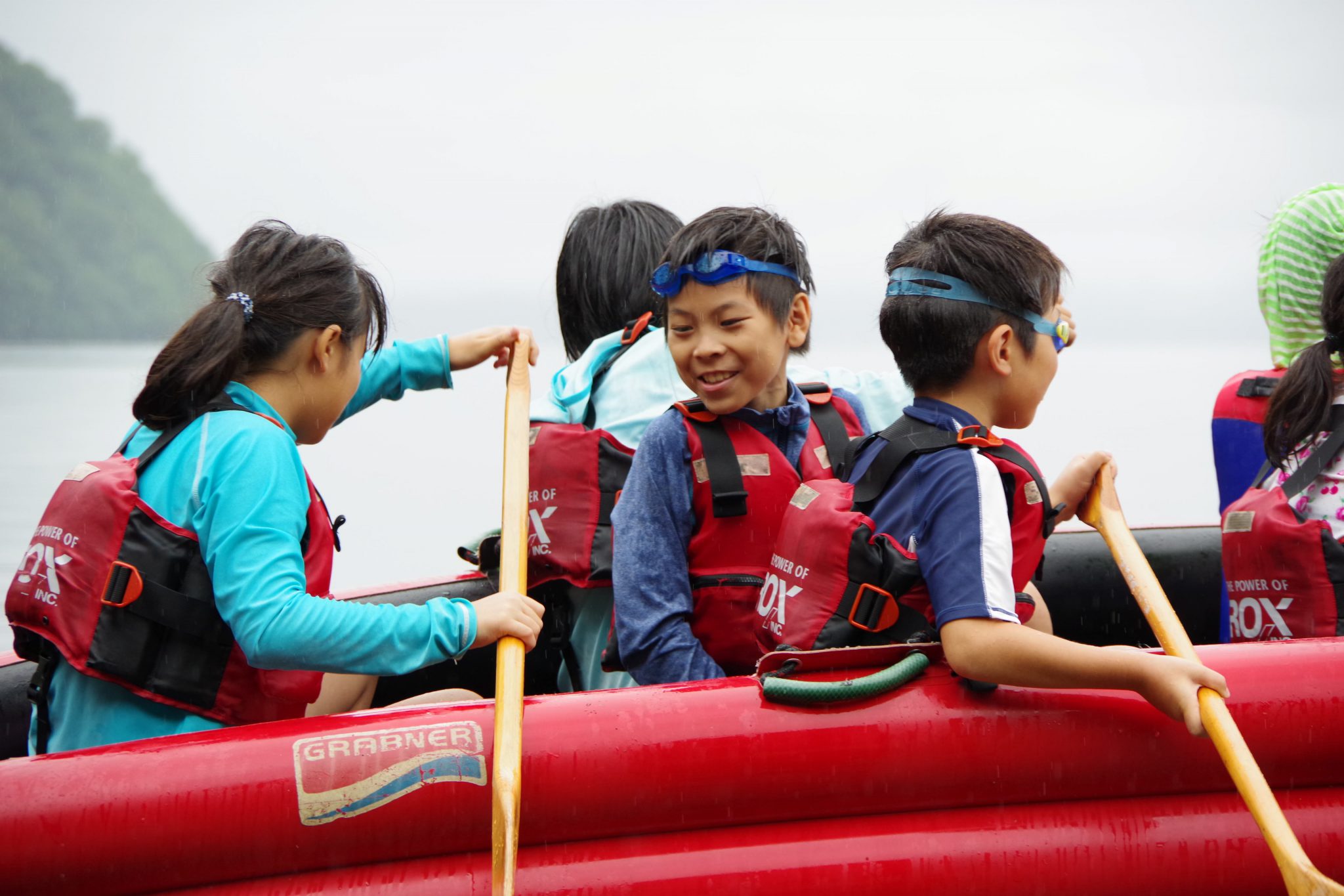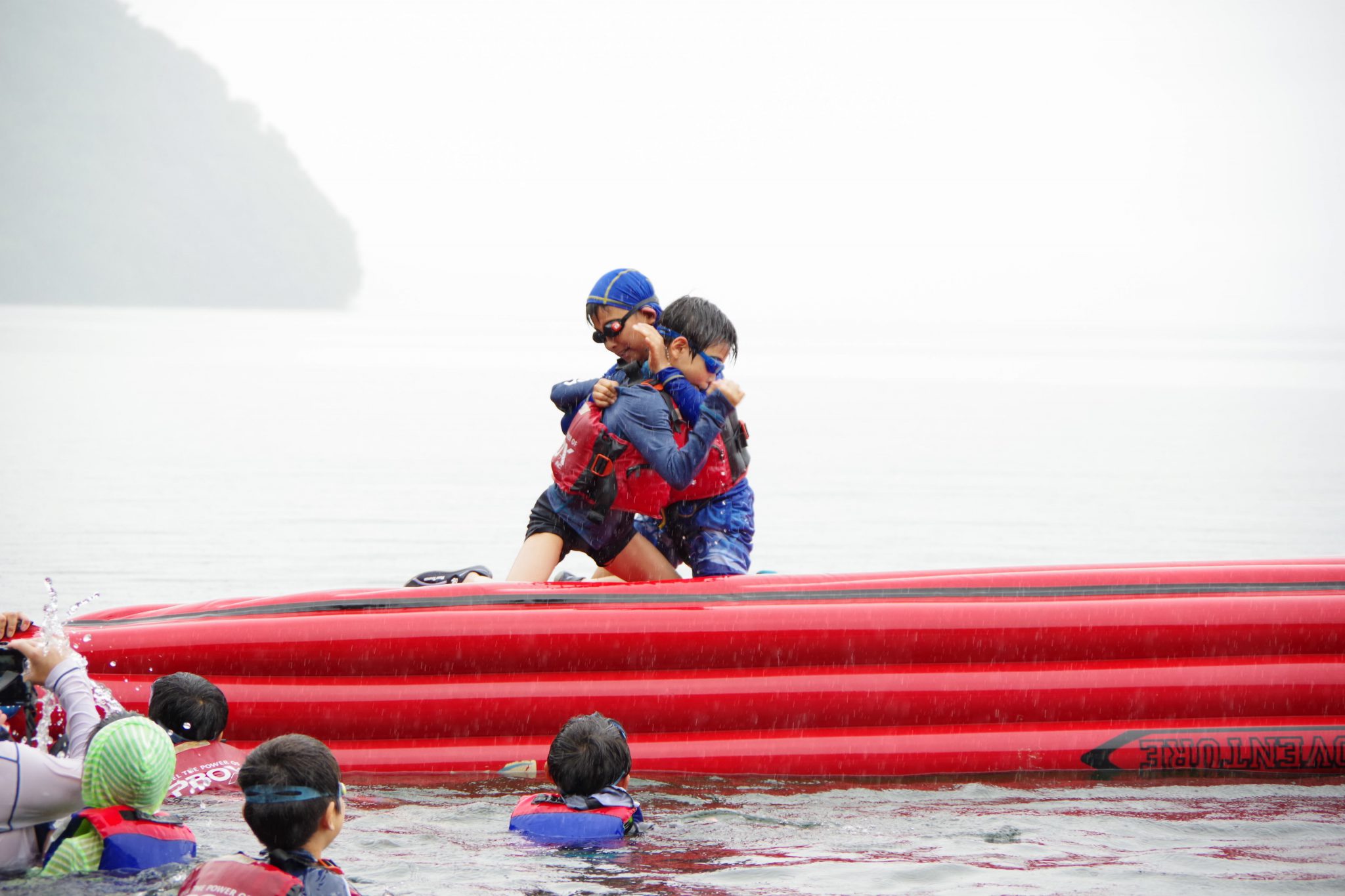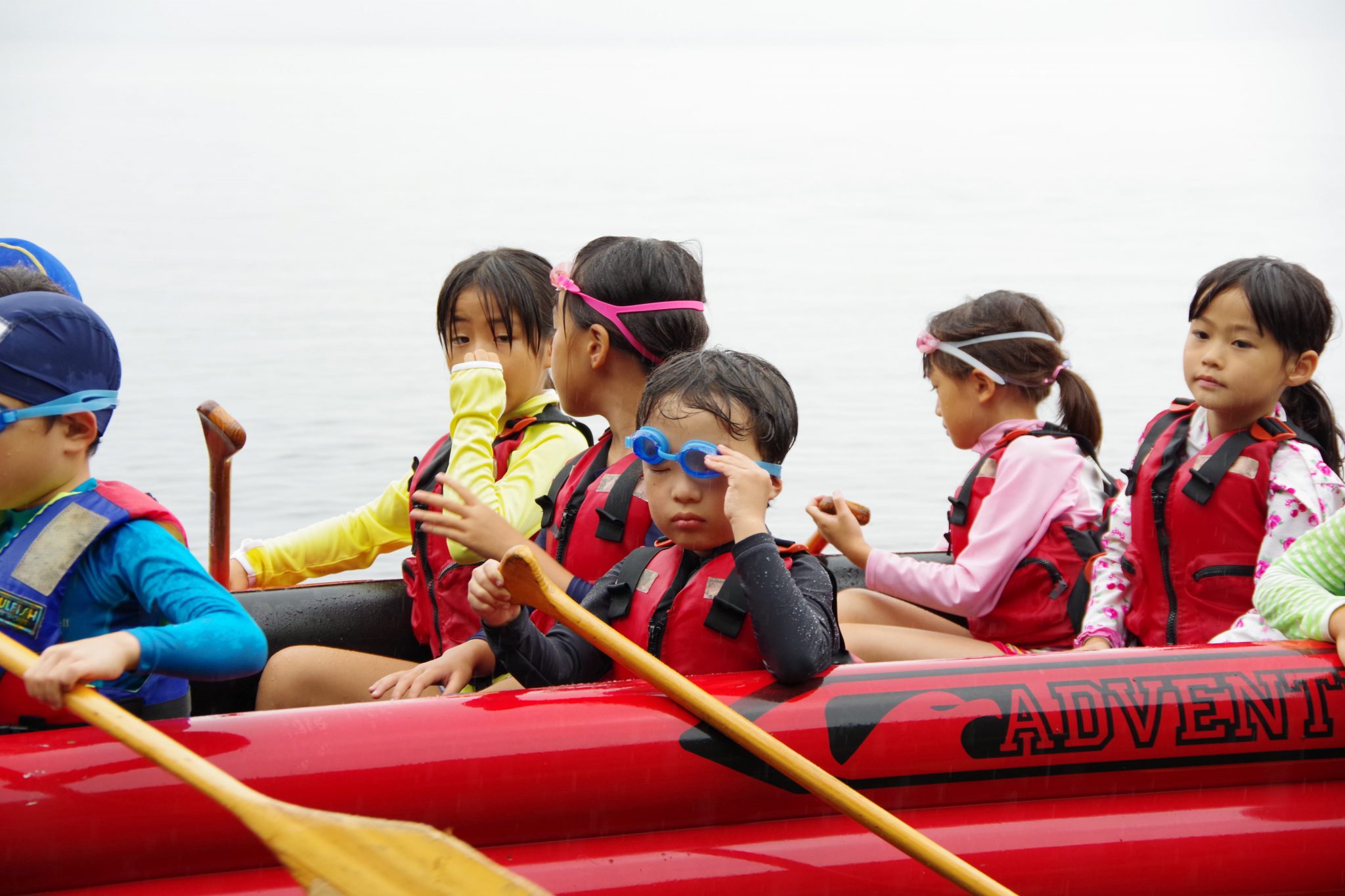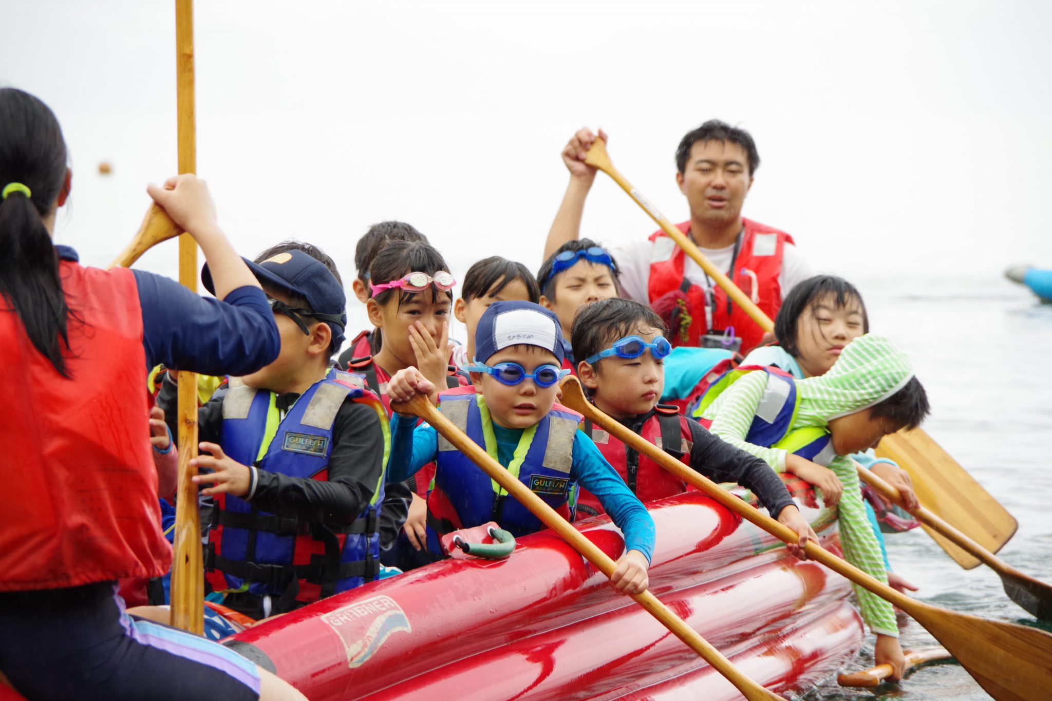 第1クールでは雨に降られたものの子ども達には関係なく、カヌーの練習をし1時間の道のりをEボートを漕ぎ、近くの浜を目指しました。