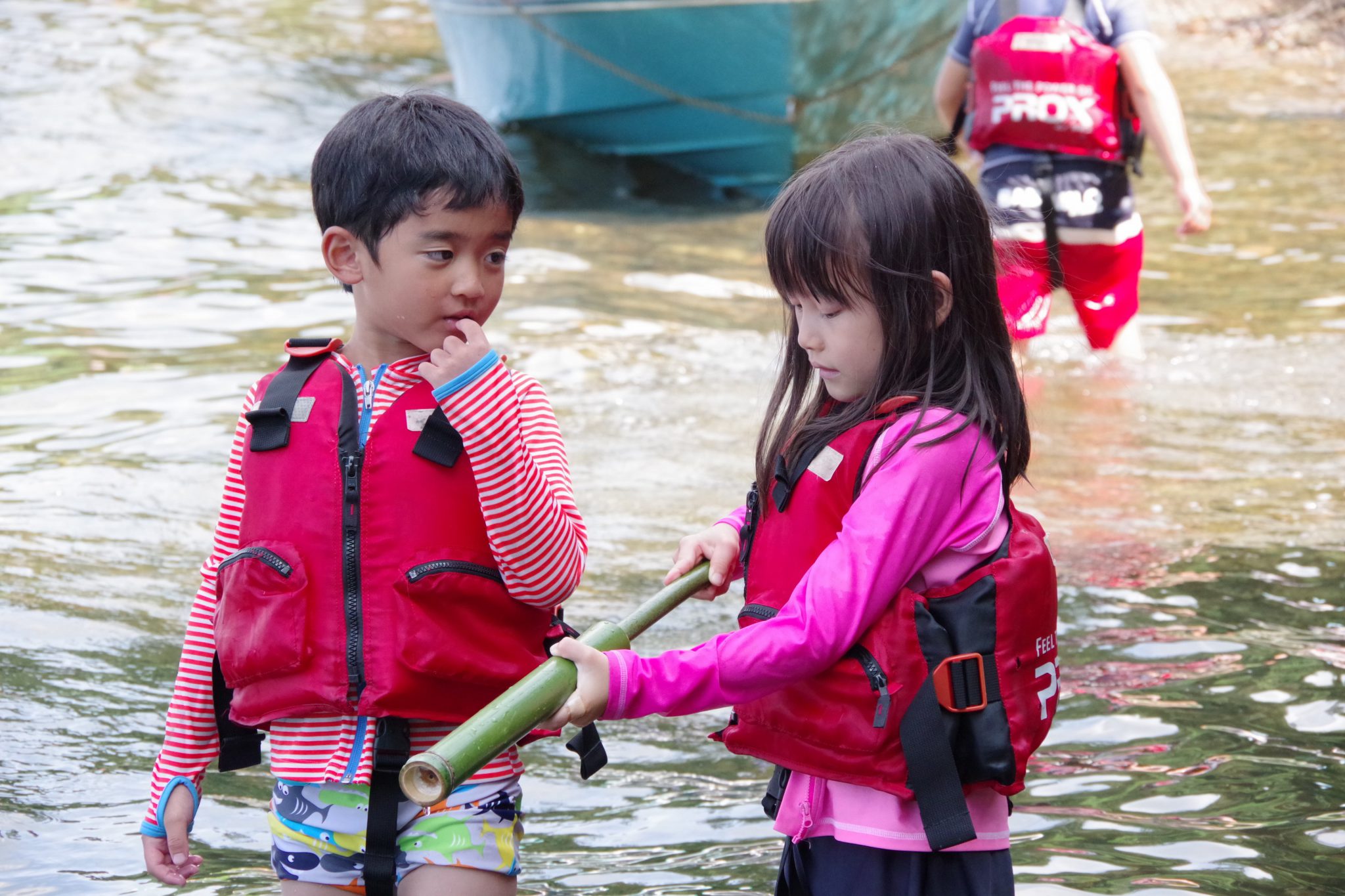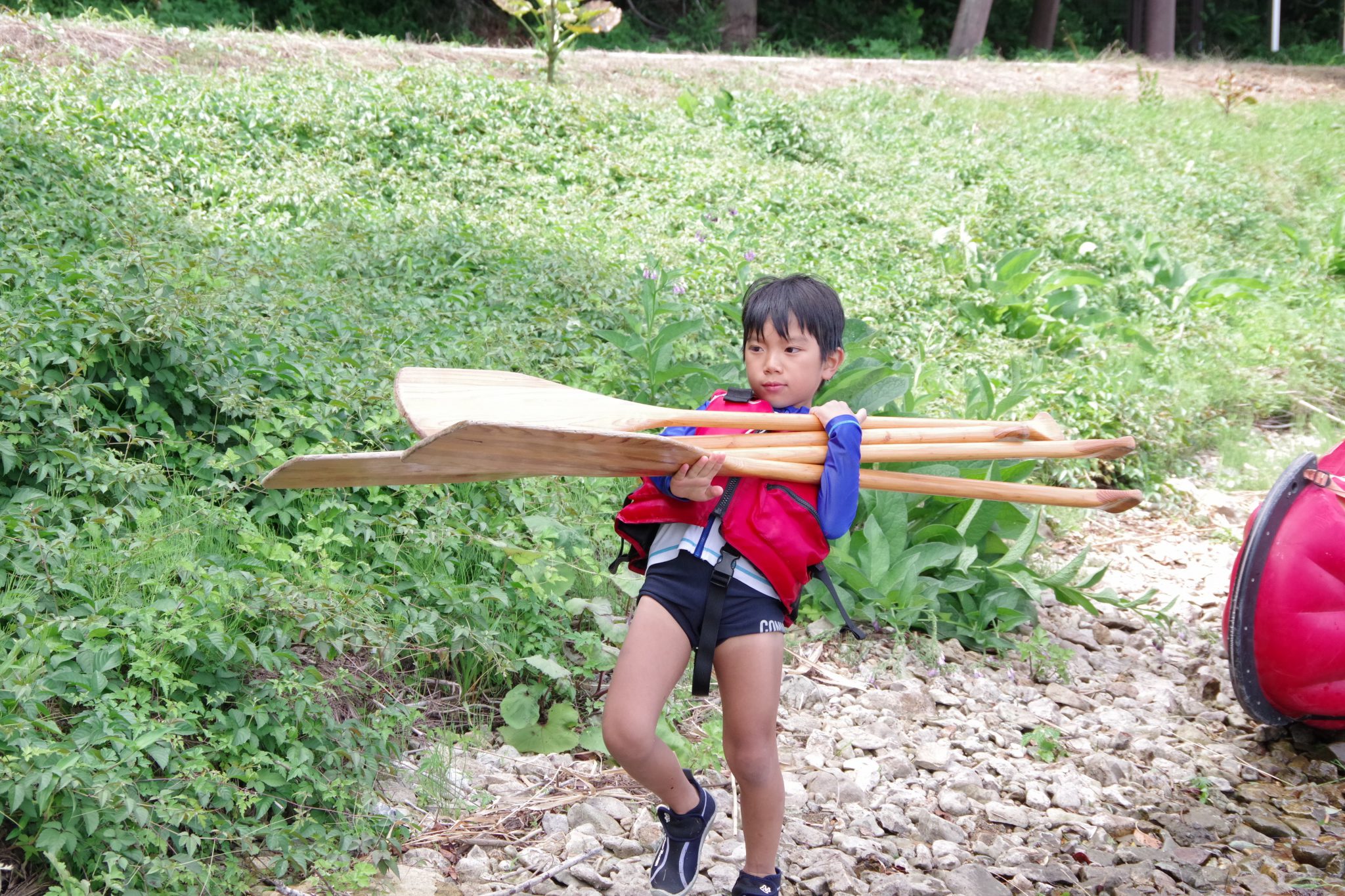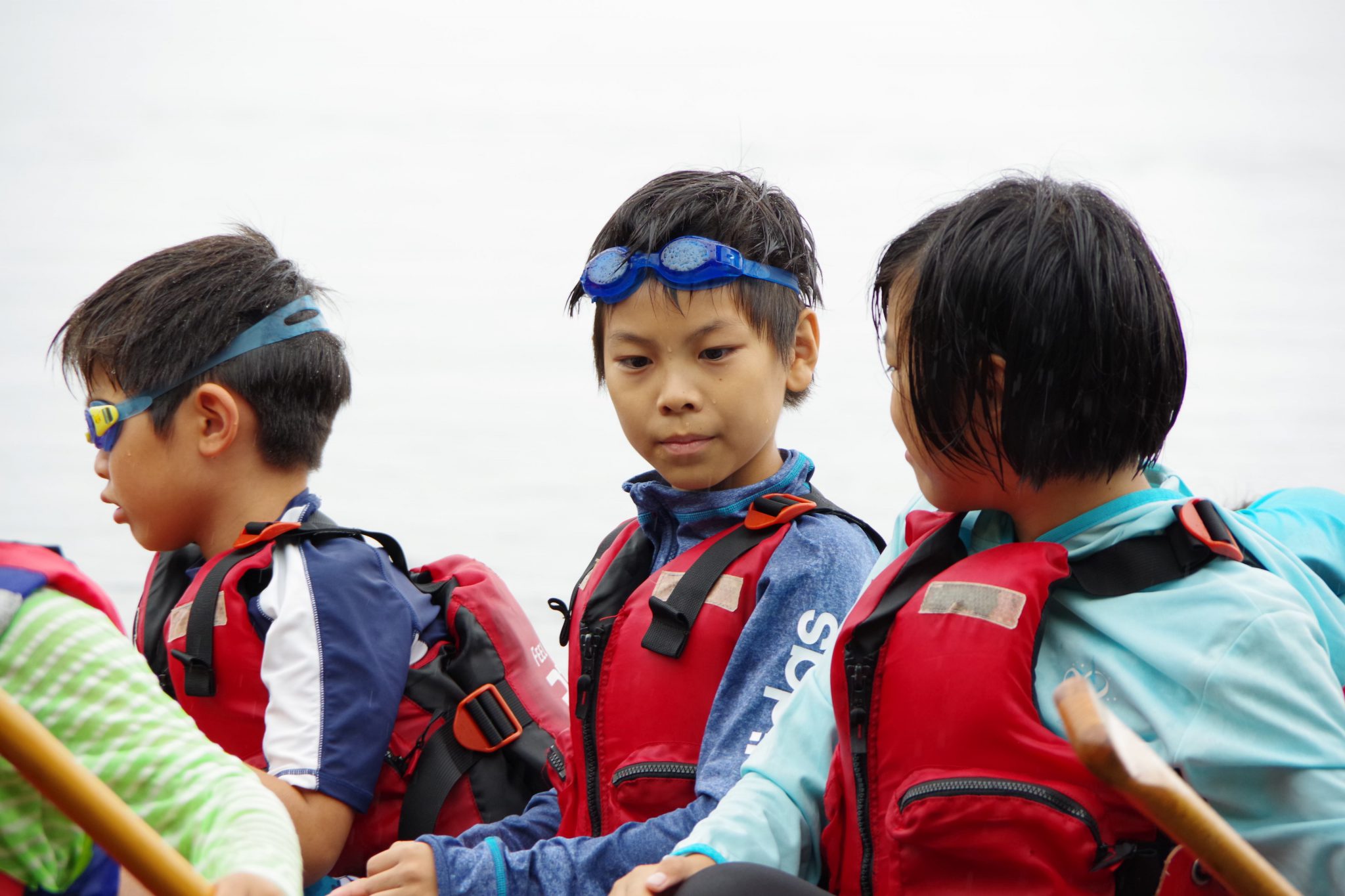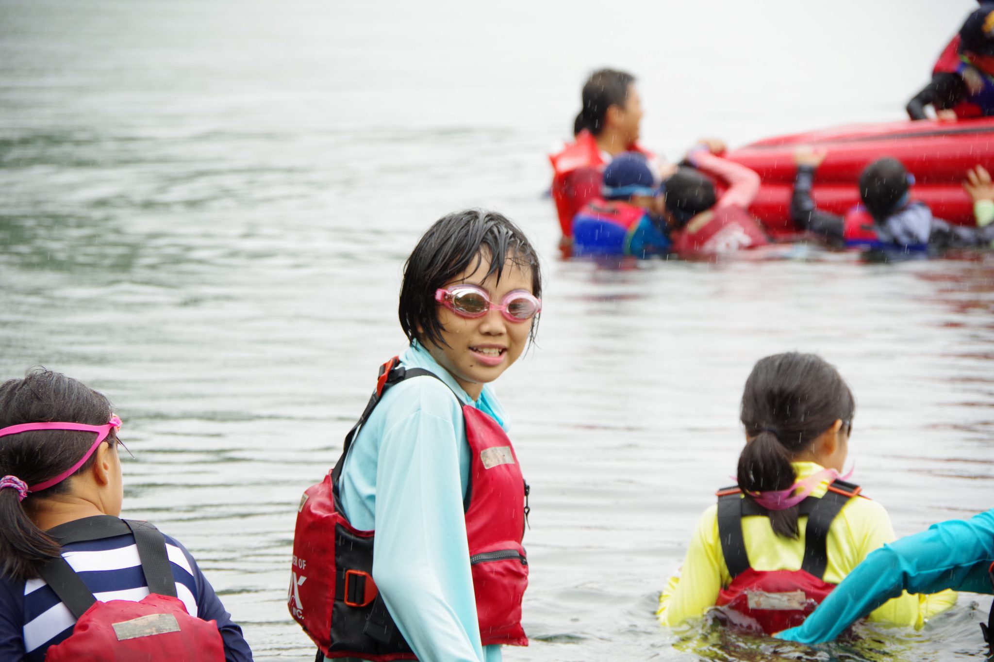 第1クールでは雨に降られたものの子ども達には関係なく、カヌーの練習をし1時間の道のりをEボートを漕ぎ、近くの浜を目指しました。