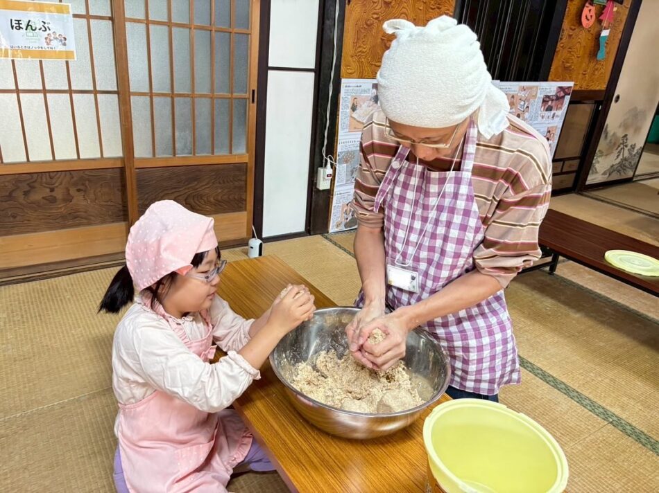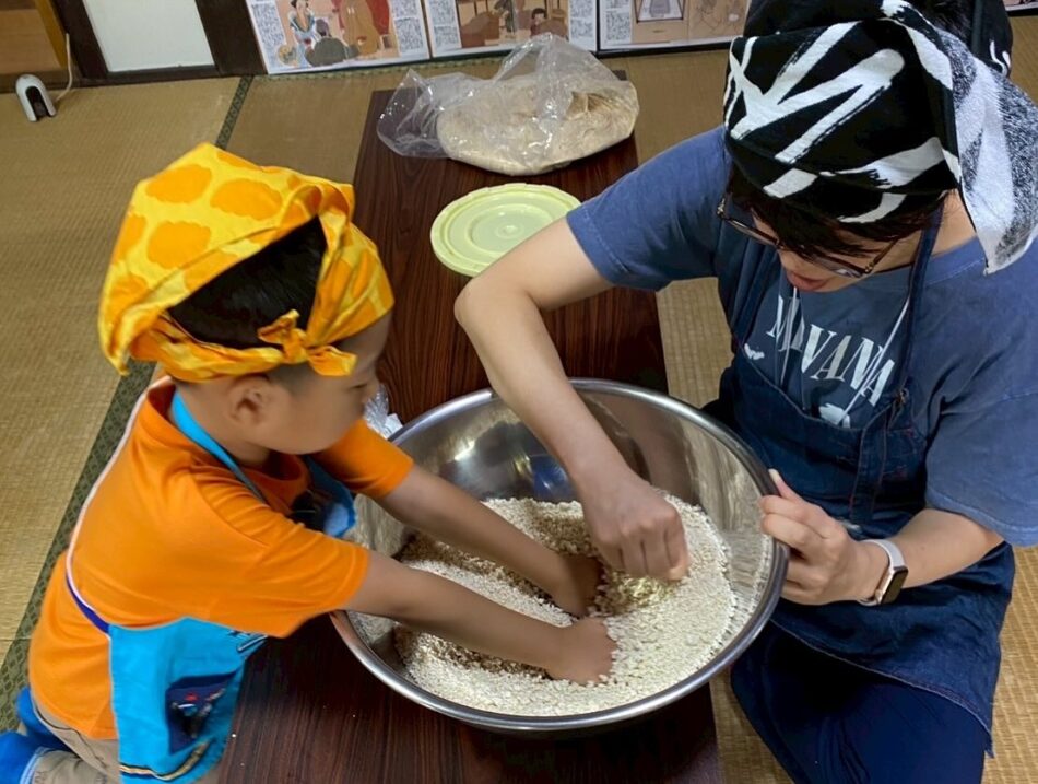 自然いっぱいの里山で自然遊び!地元の糀屋さんにお越しいただき、年に1度の味噌づくり体験も行います。