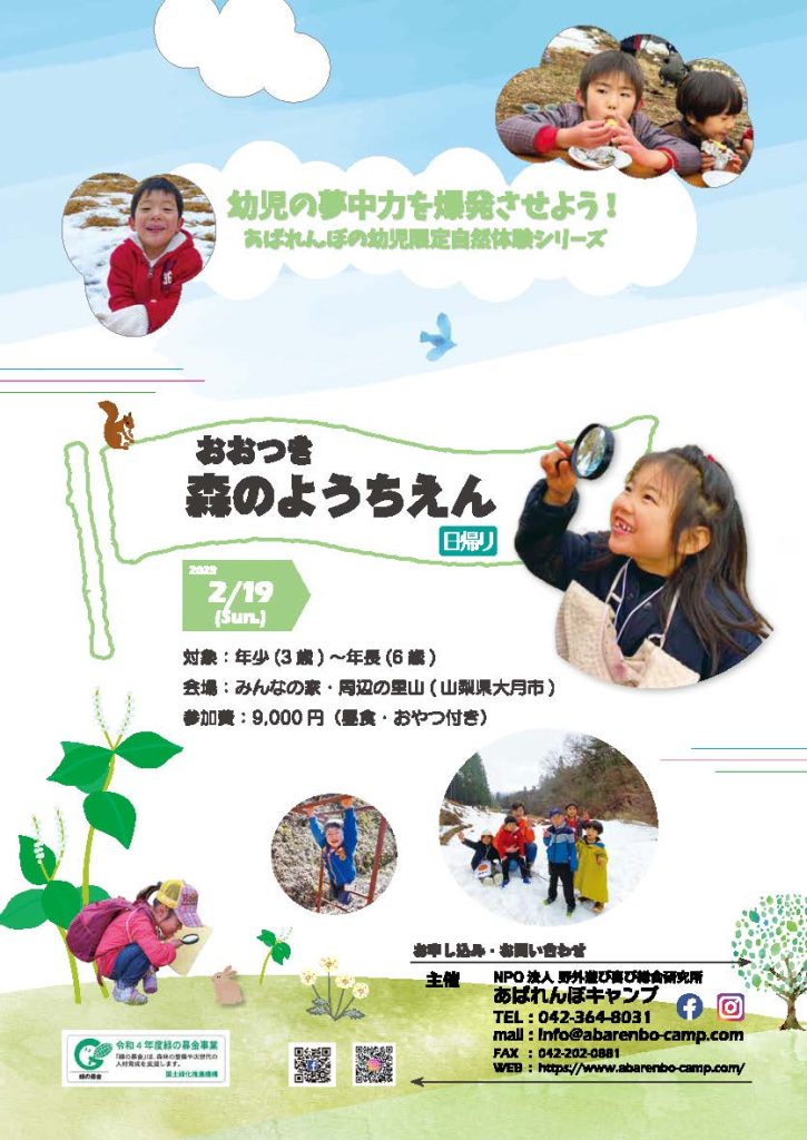 幼児限定日帰りキャンプ「おおつき森のようちえん」。親元を初めて離れるお子様にオススメのプログラム!「お泊まりに行かせるのはまだ不安…」という親御さん、まずは日帰りキャンプから始めてみませんか?