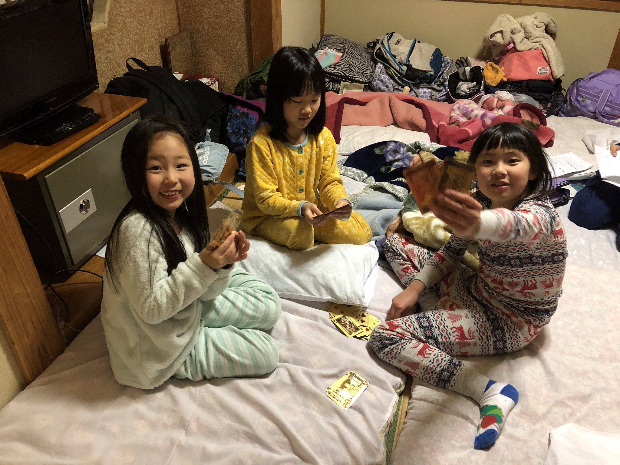スキーの後は、みんなでお風呂と夕食です。ごちそうさまの後は、みんなで仲良くお楽しみ会をしました。あっという間の1日目、みんなすぐに眠りにつきました。