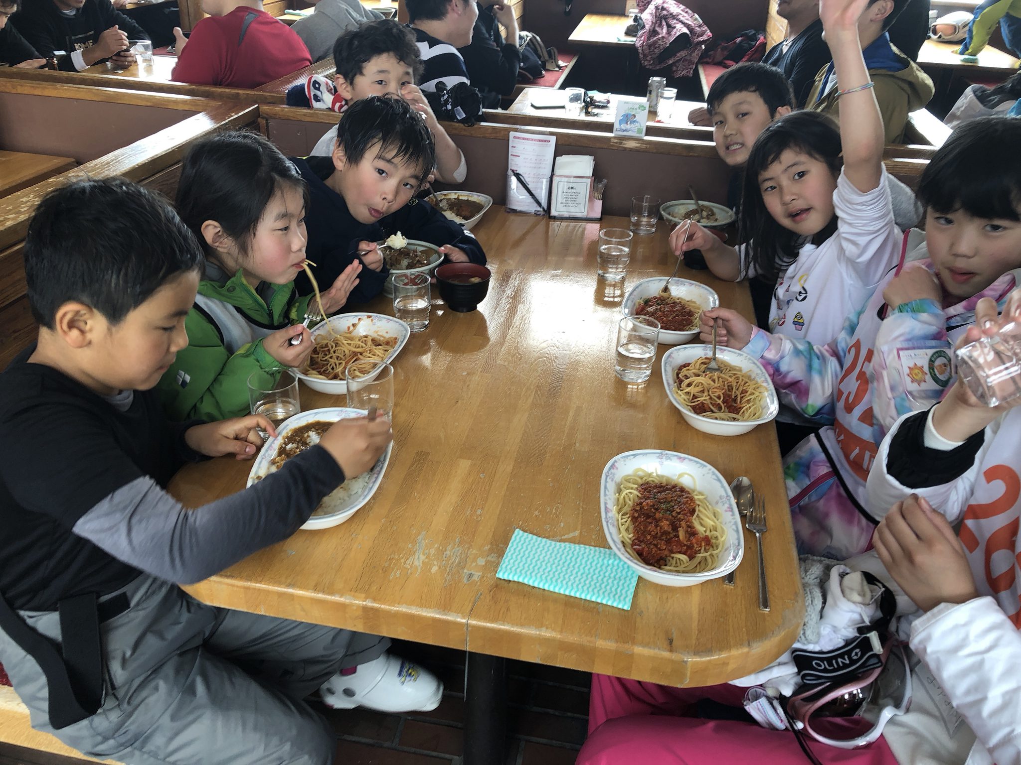 「雪があるの?」「リフトは?」「どんな所に泊まるの?」など、ドキドキワクワクの車内でした。スタッフによるバス内レクリエーションを楽しみながらおやつを食べ、お昼過ぎに宿泊先に到着、お腹ぺこぺこでお昼ご飯となりました。