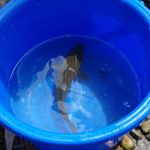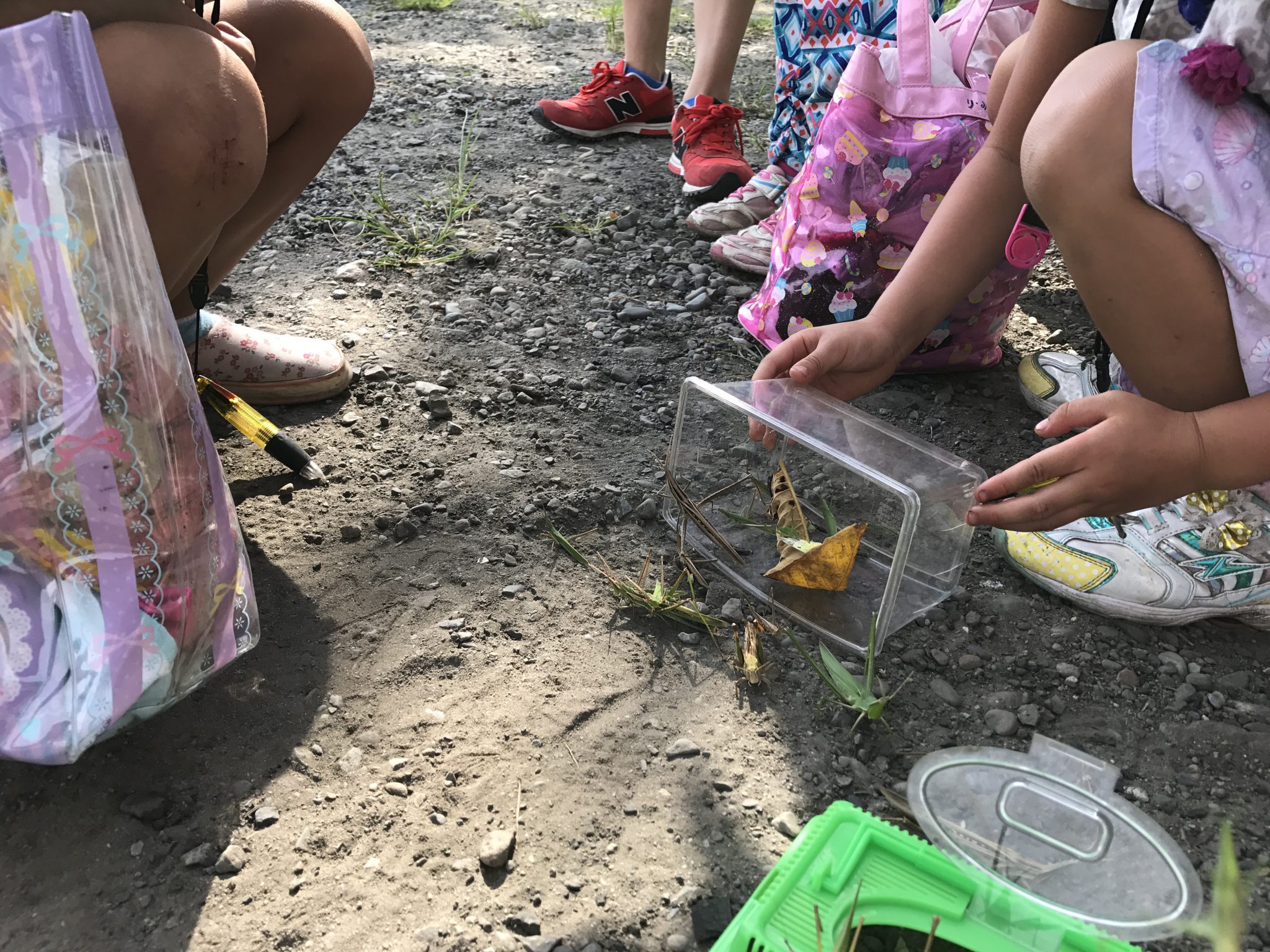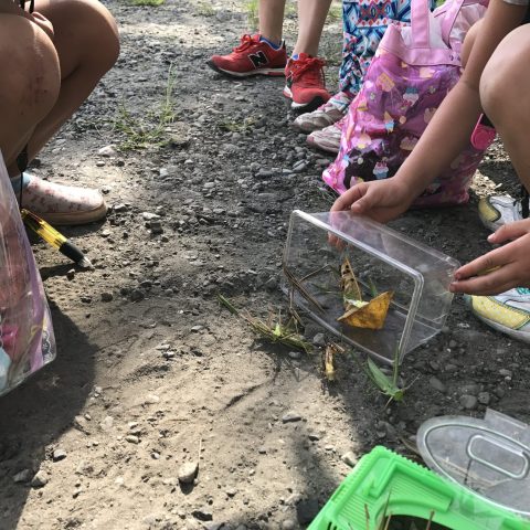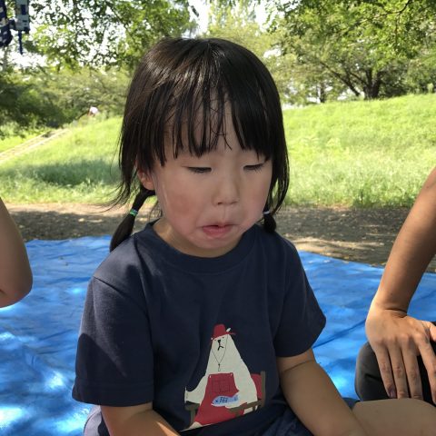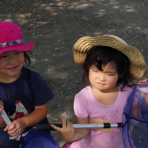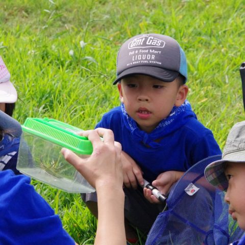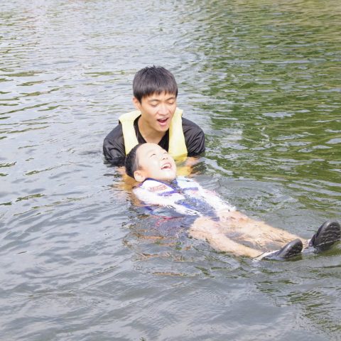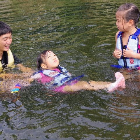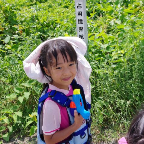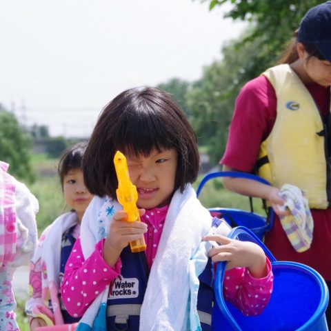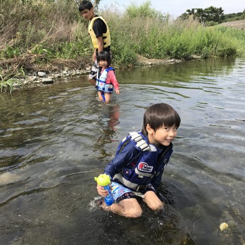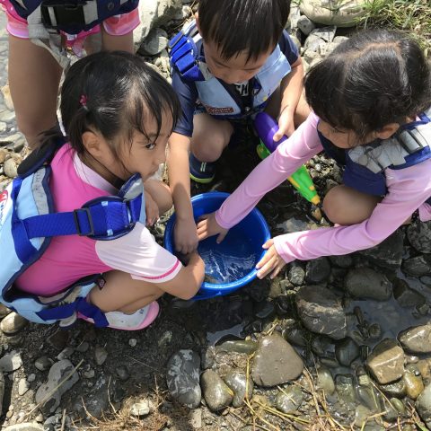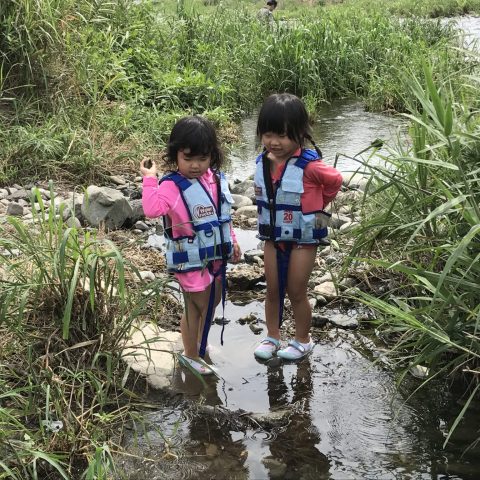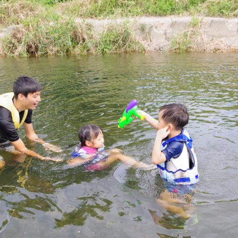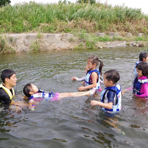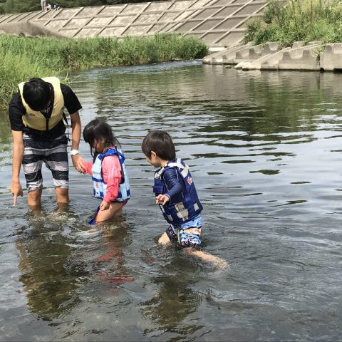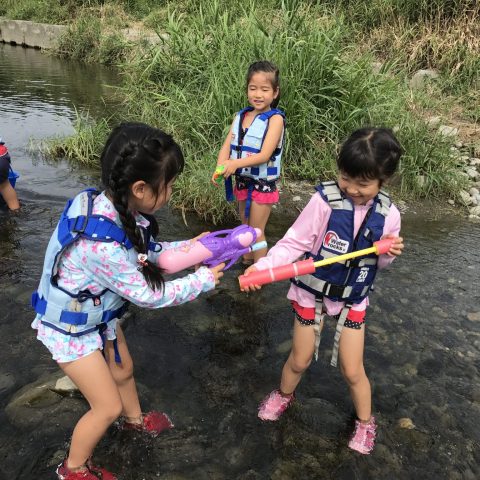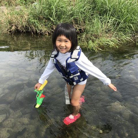 川遊びでは、浮かんでみたり、水鉄砲で友達を狙ってみたり、川で遊んでいたお兄さんの捕まえた魚を見たりダイナミックに遊びました。