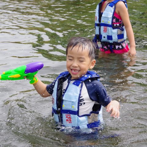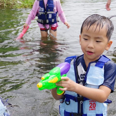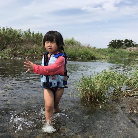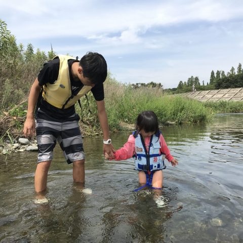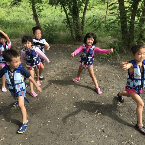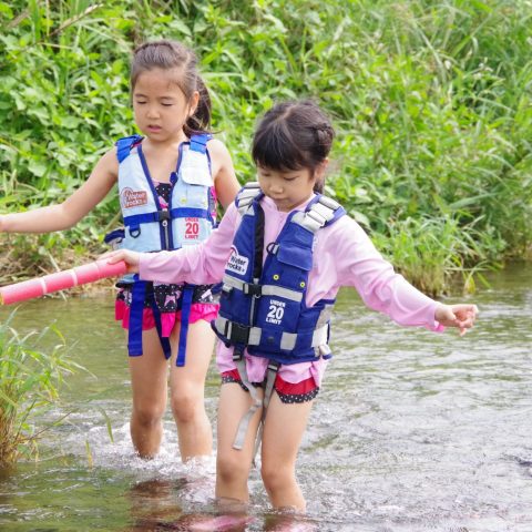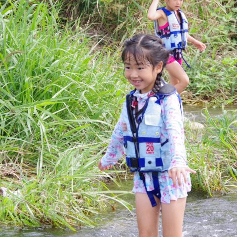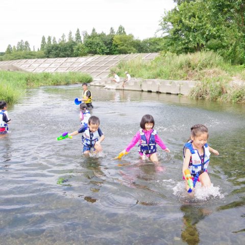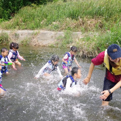 始めは川に対する恐怖心を抱いていた子も徐々に慣れ、最後には友達と一緒に水の掛け合いをする場面も見られました。
