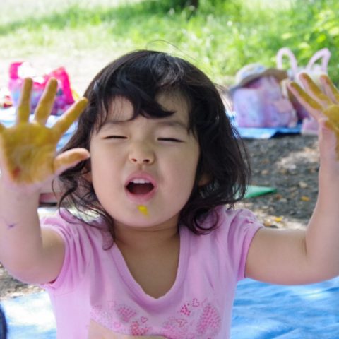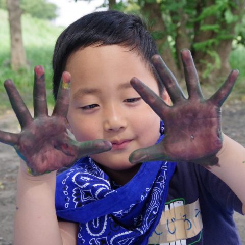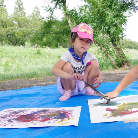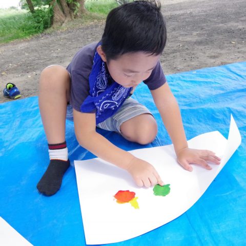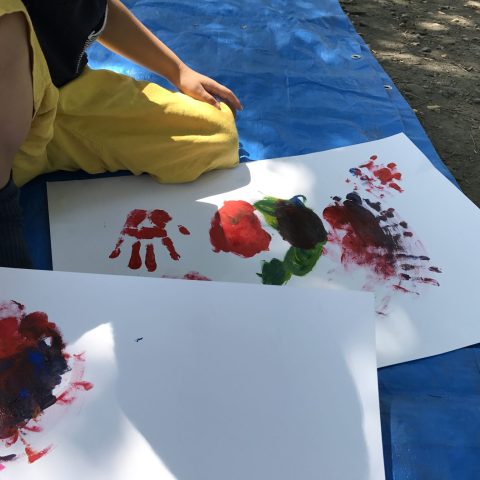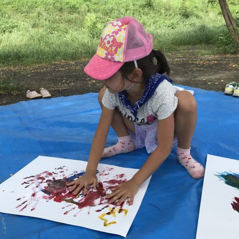 28日は年中、年長の2人が年少の2人の面倒を見ながら川遊びやフィンガーペイントをしました。