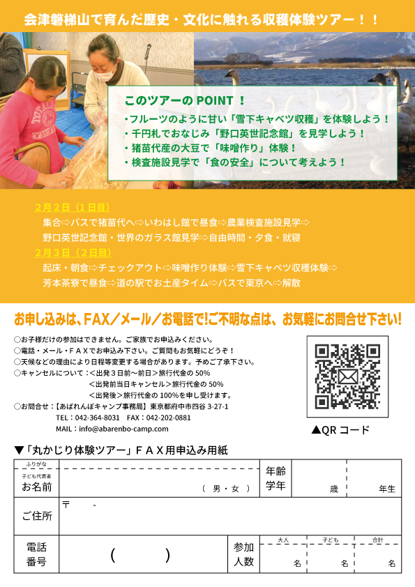 今年度も猪苗代観光協会様が主催となり、あばれんぼキャンプが運営協力をさせていただく体験型バスツアー「福島でがっつり!丸かじり体験 in猪苗代」の開催が決まりました!