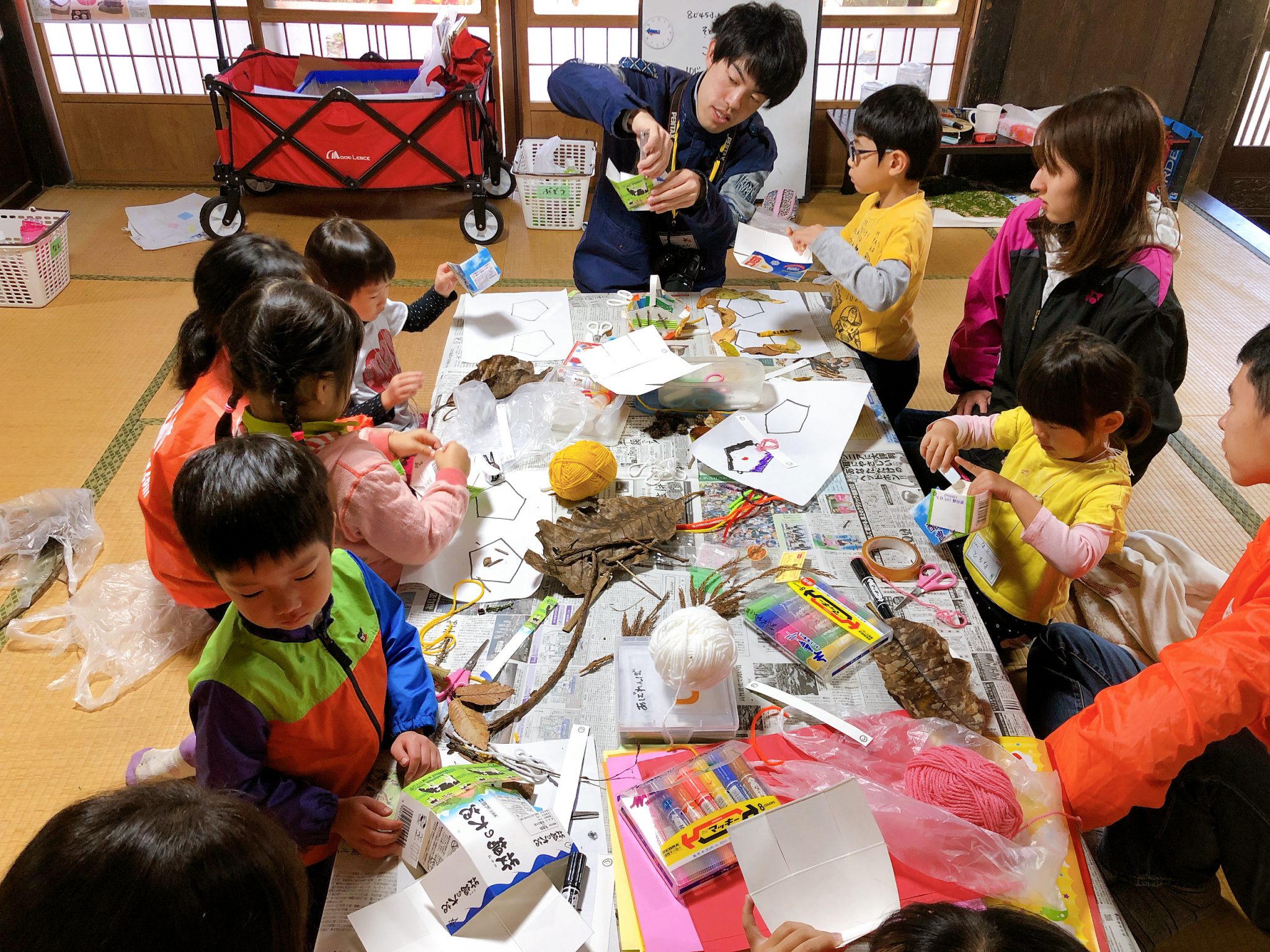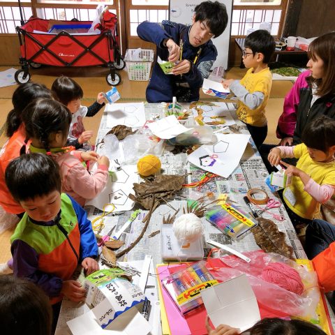 2日目は古民家周辺に落ちている葉っぱや枝を使ったオリジナルの工作づくり。