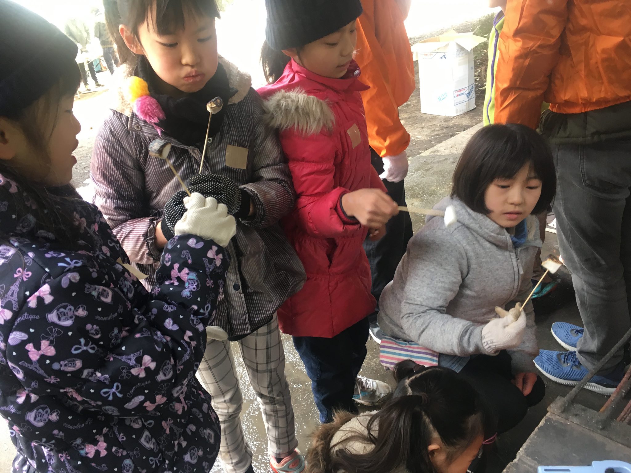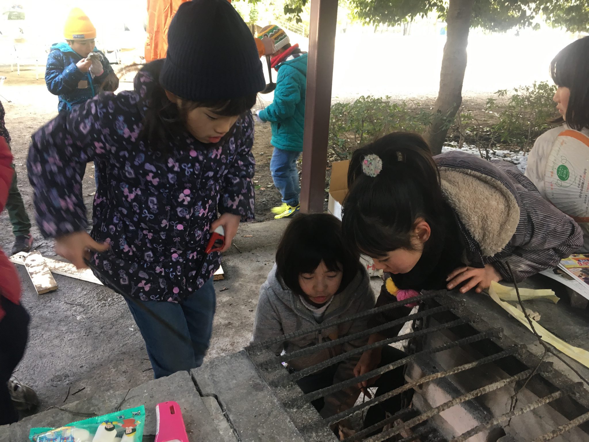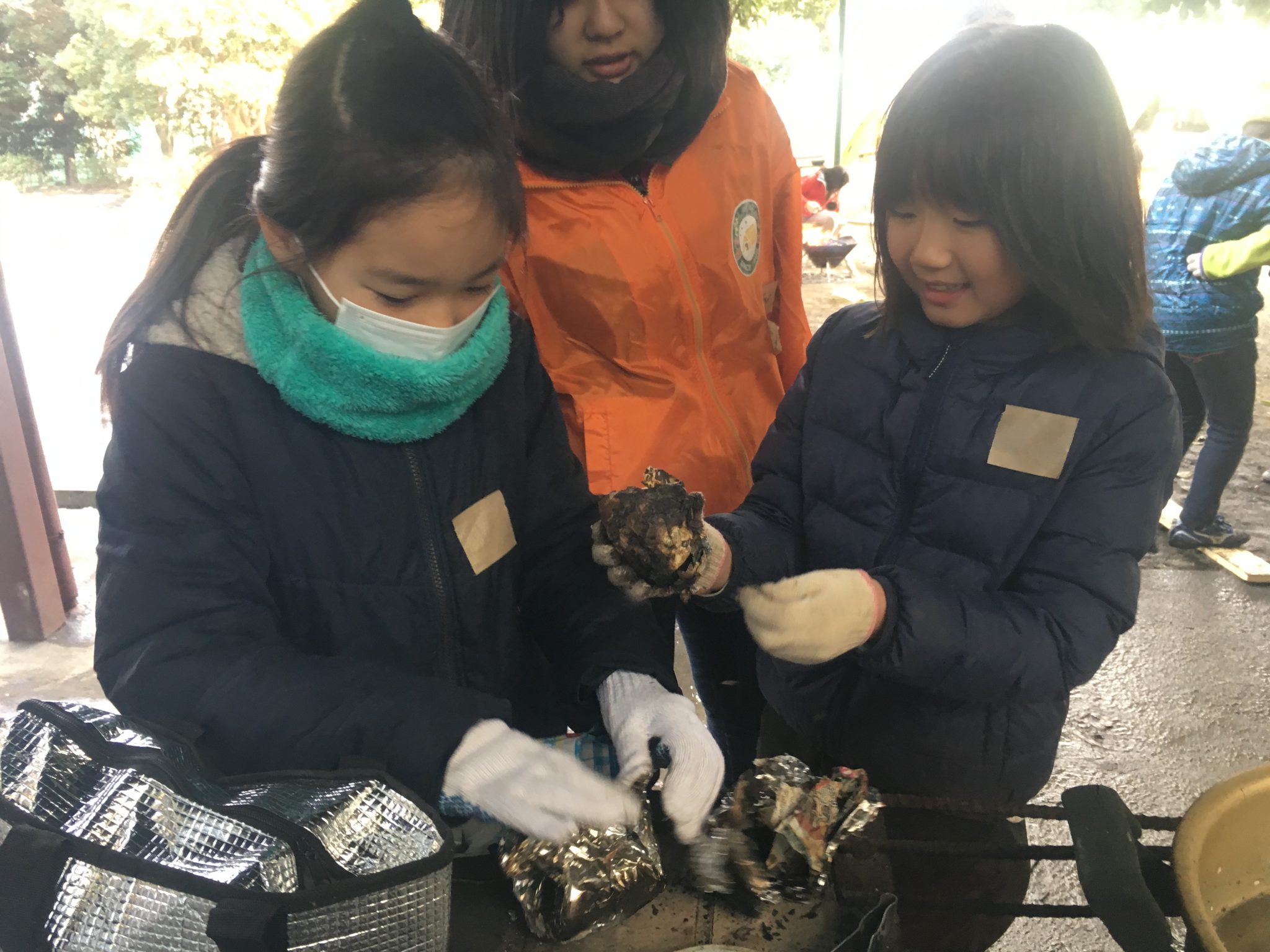 持って来た芋が焼けなくて、他の人が焼くのを見ながらやってみる子