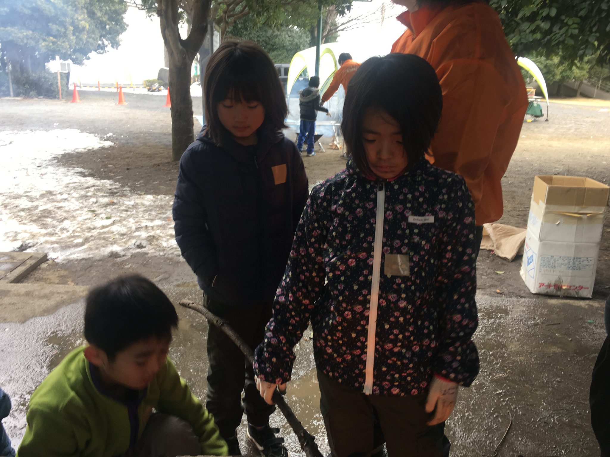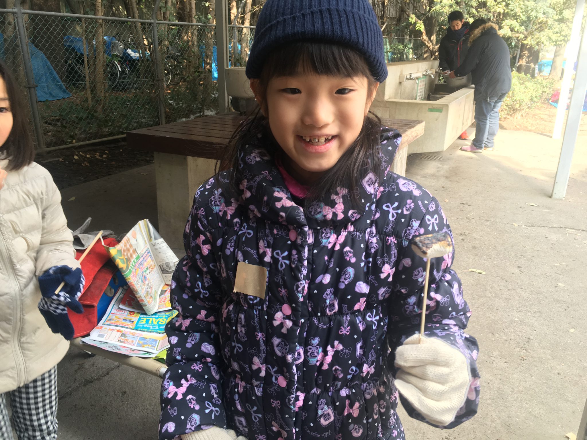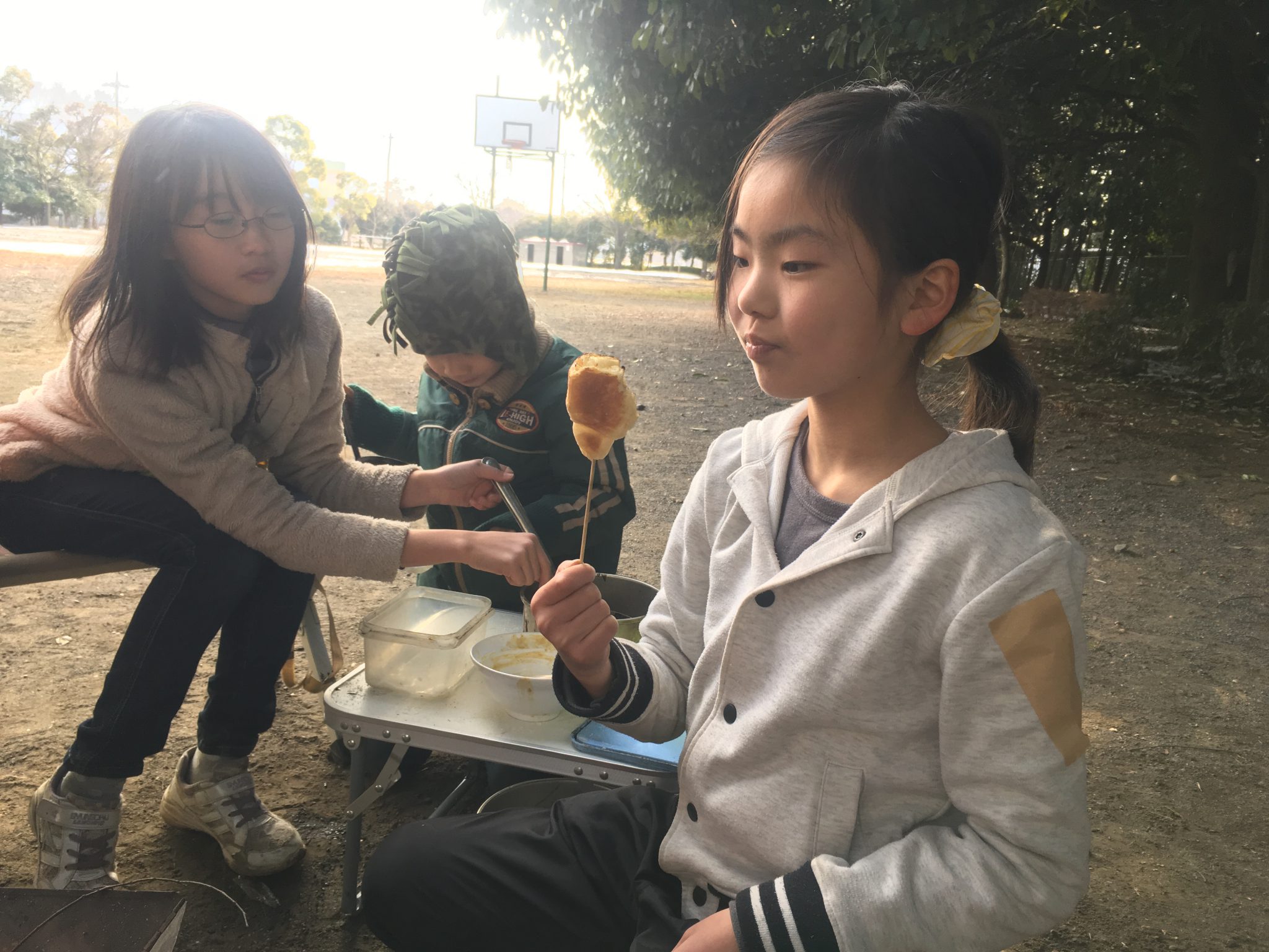 持って来た芋が焼けなくて、他の人が焼くのを見ながらやってみる子