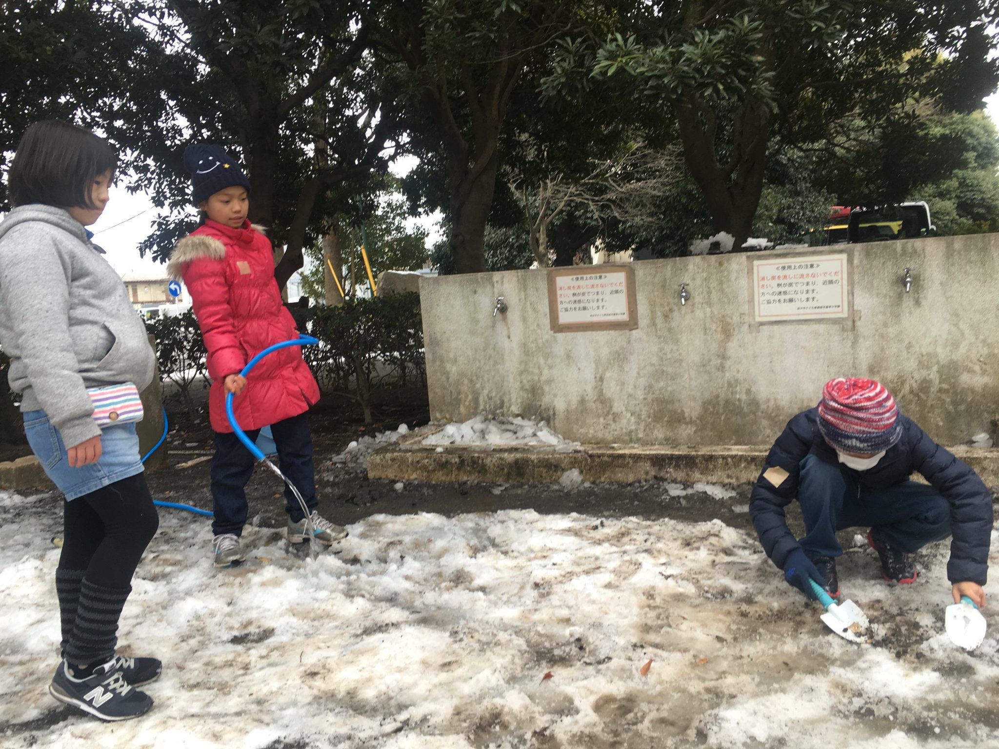 雪を均し、水をかけてまるで職人のようにスケートリンク作りに励む子