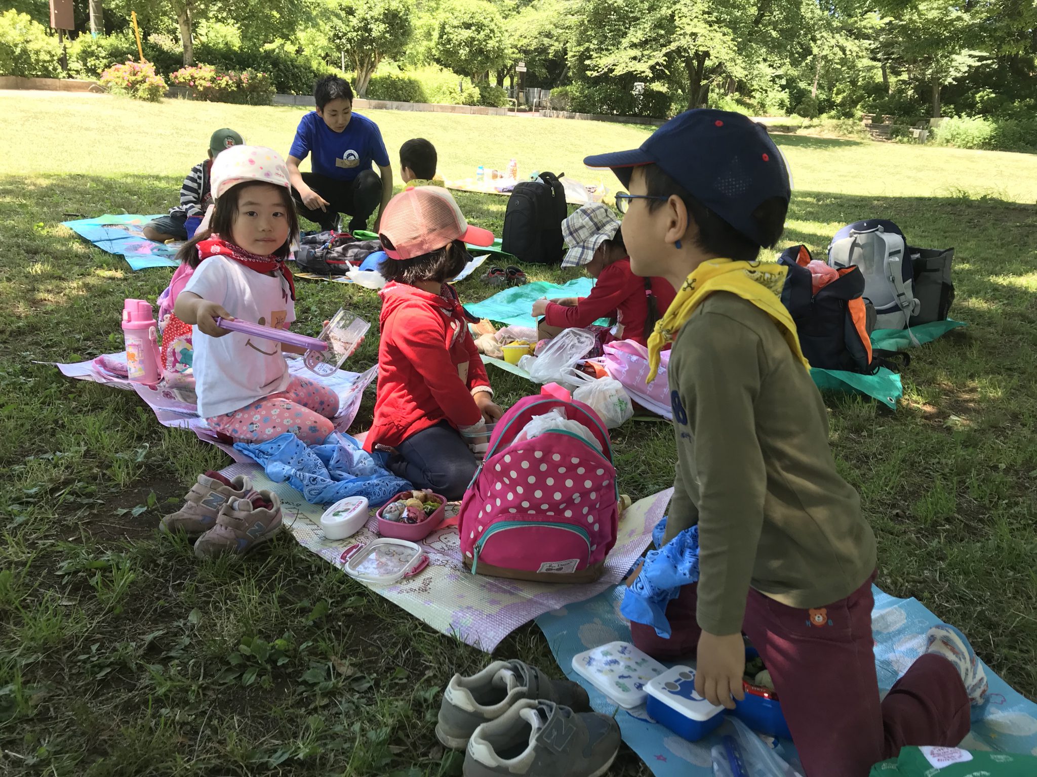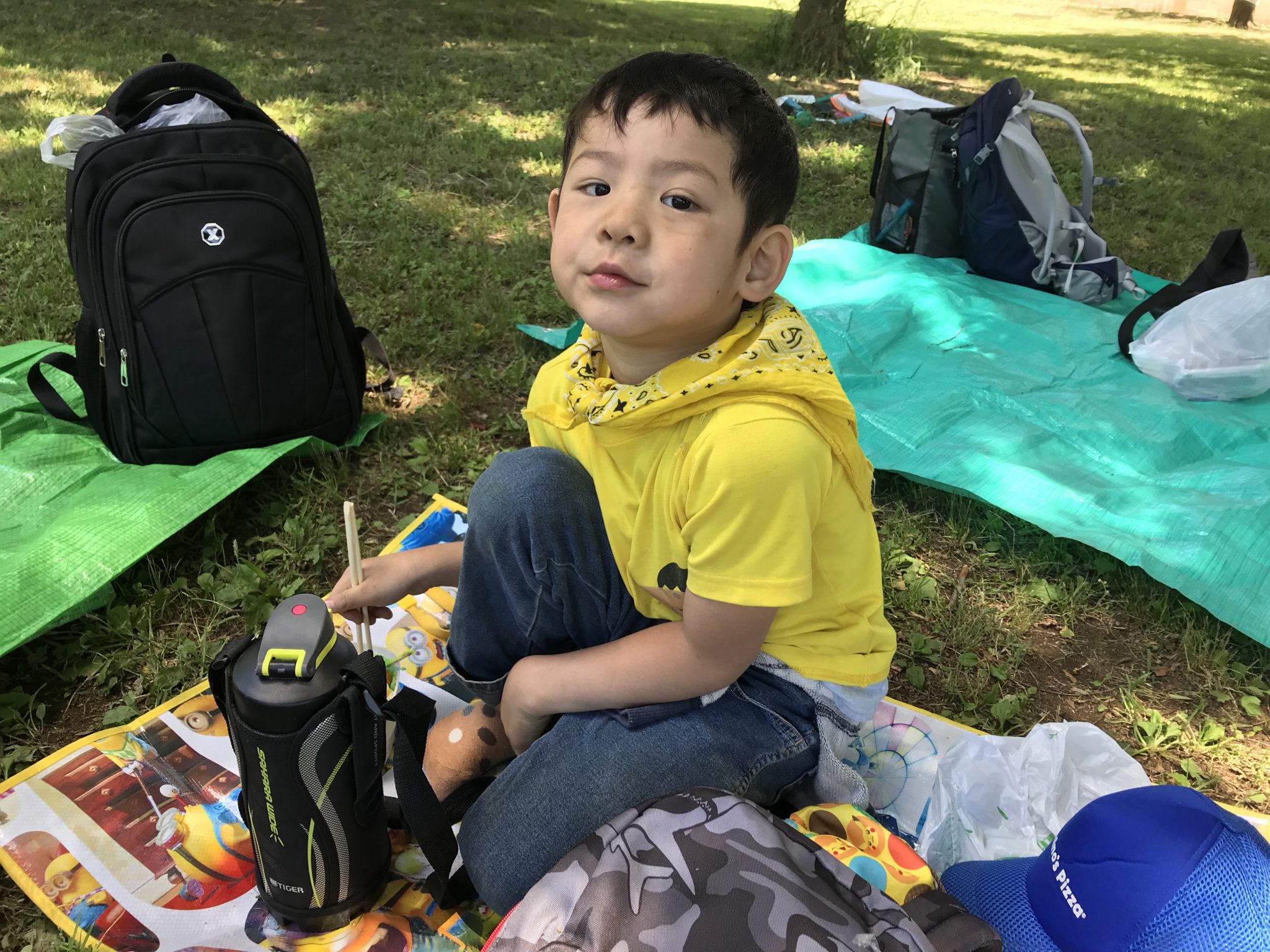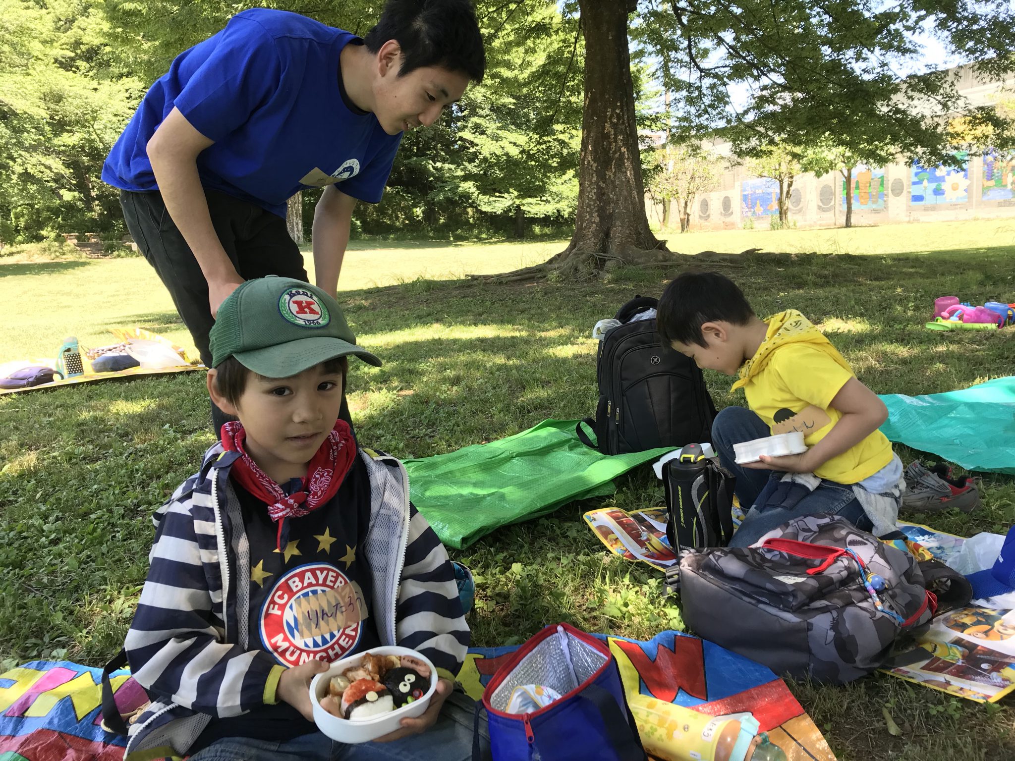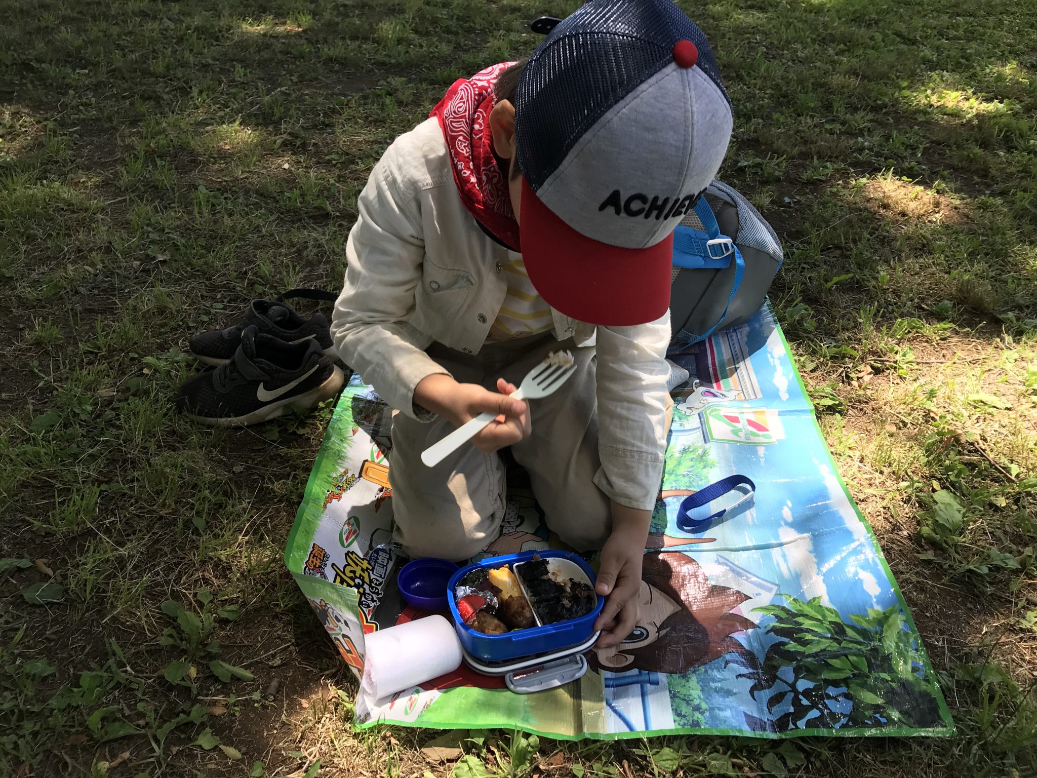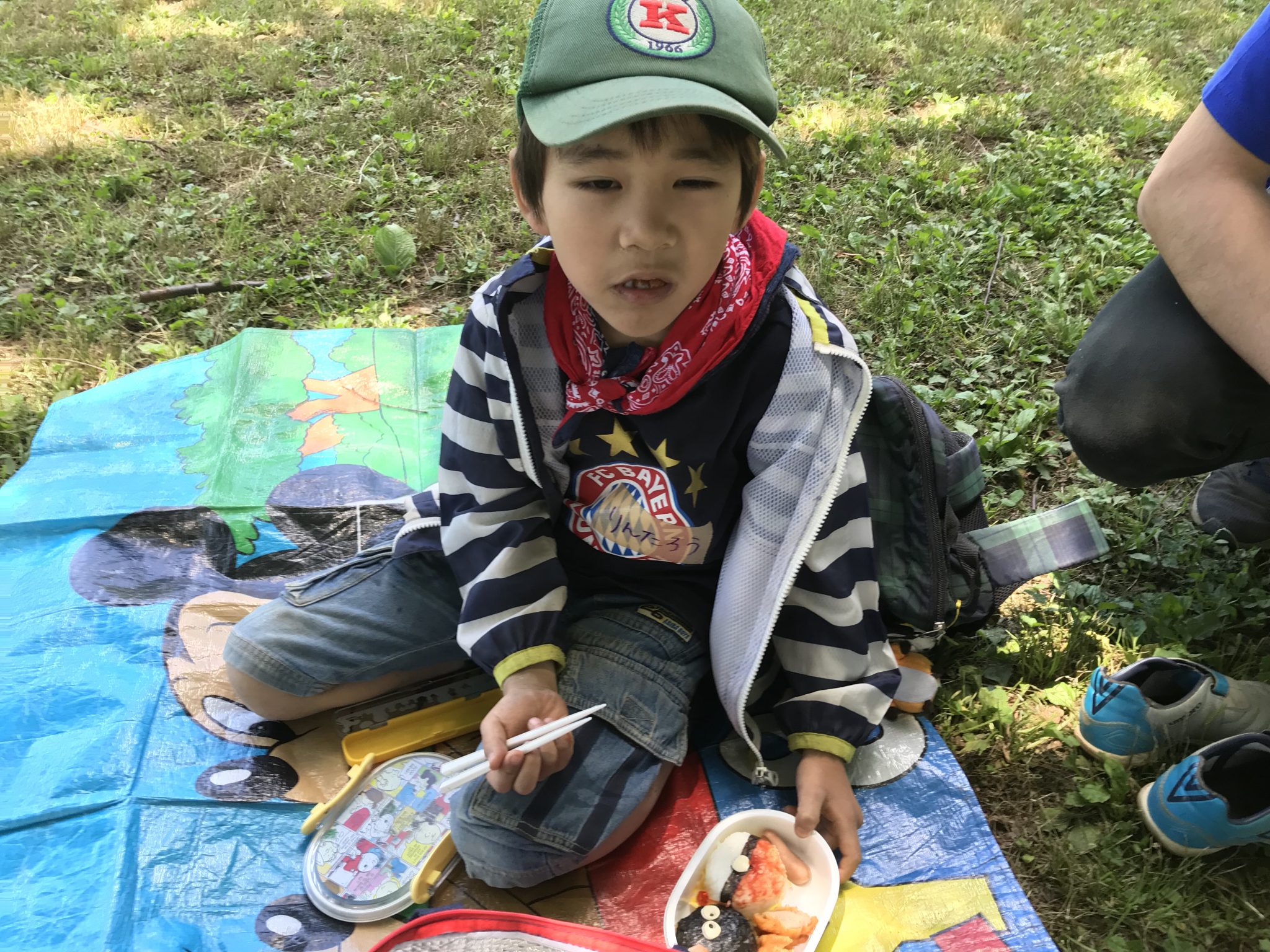 森のようちえん一行は、お腹が空いたのでお昼ご飯を食べてます! みんなで美味しく食べてます!