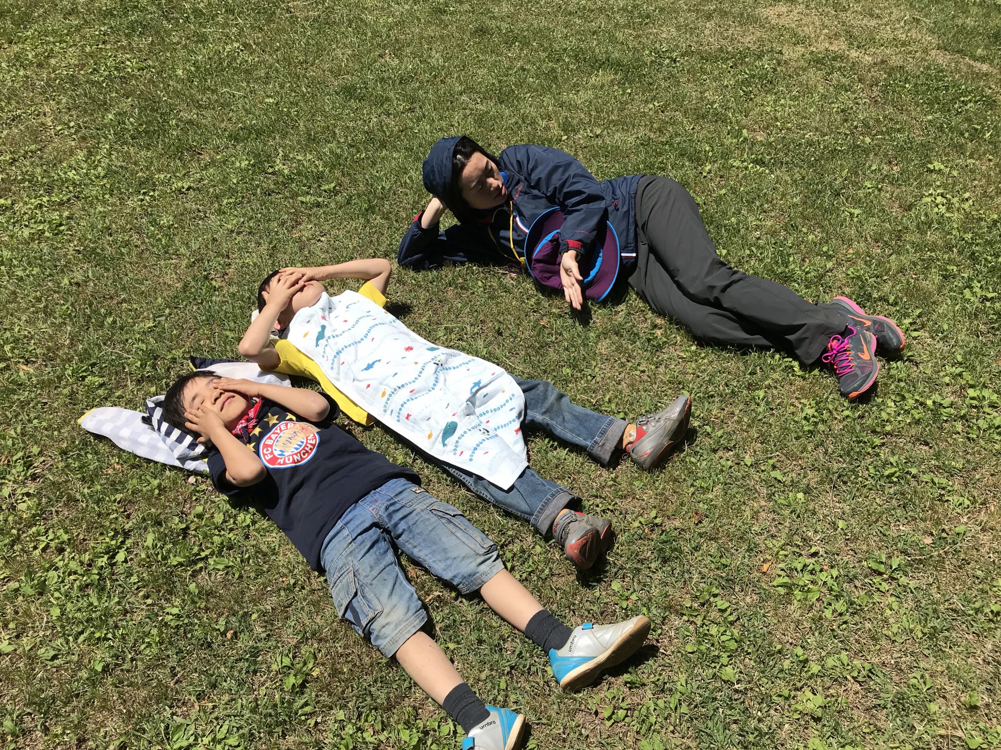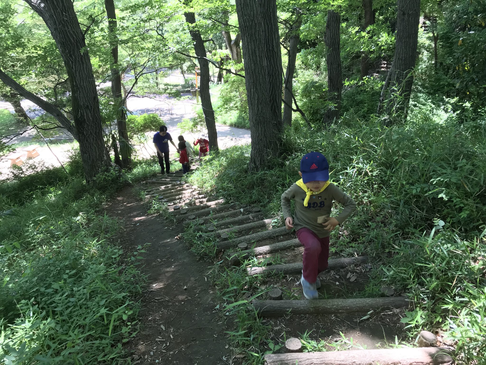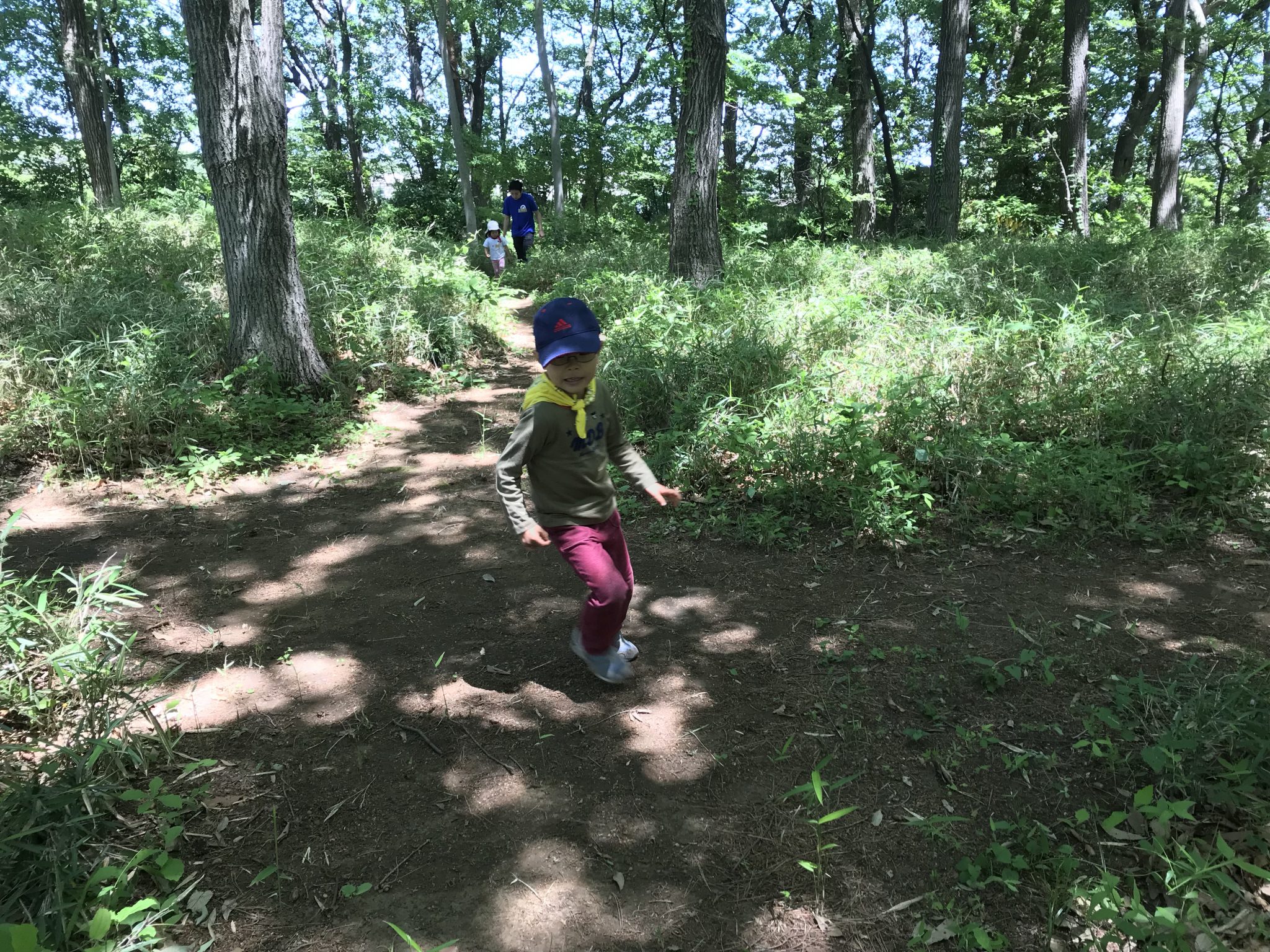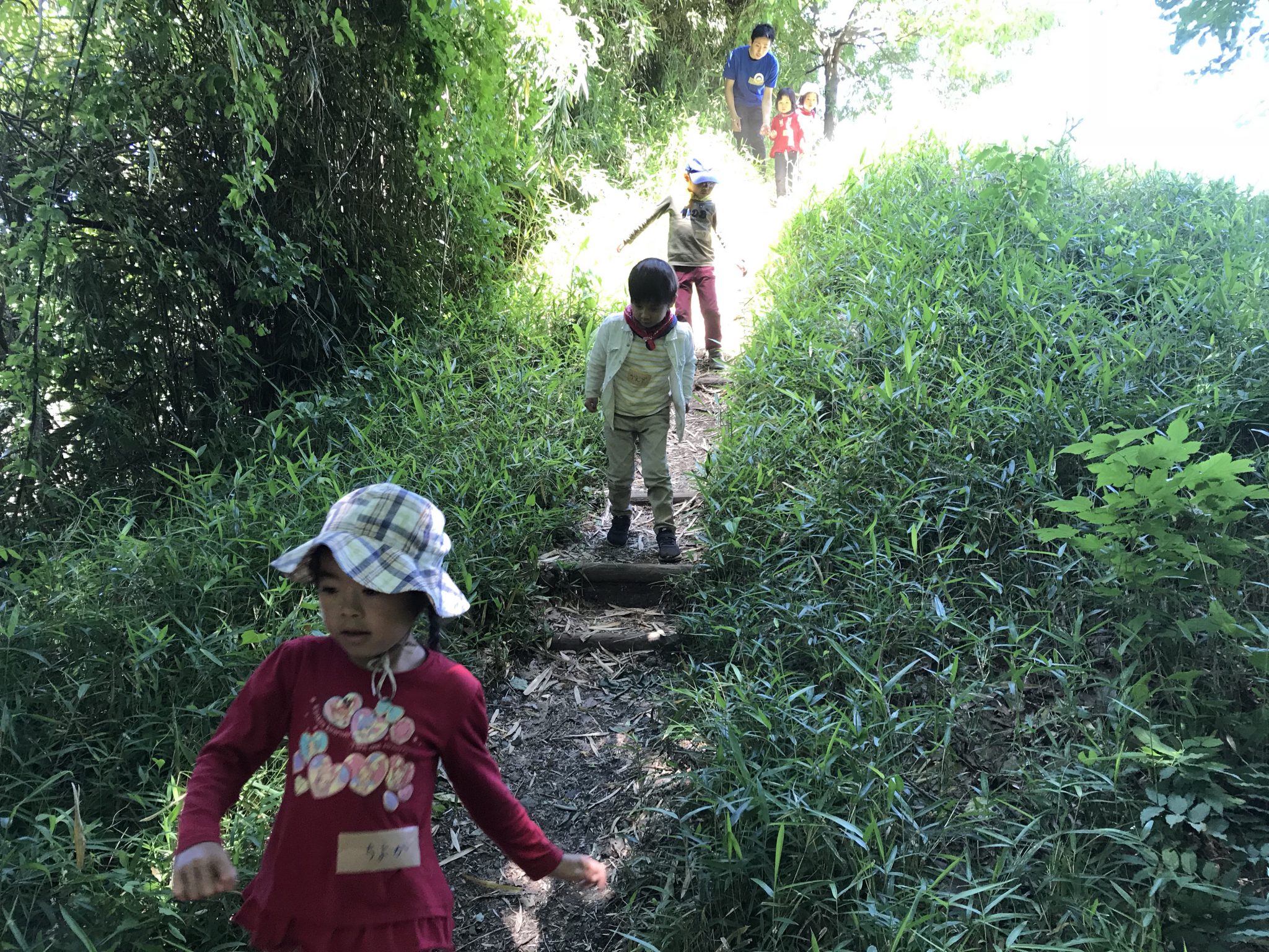 森のようちえん一行は、お昼ご飯を残さず食べ、午後の遊びを始めました! 探検、お昼寝、遊具遊び… みんなで仲良く遊んでいます。