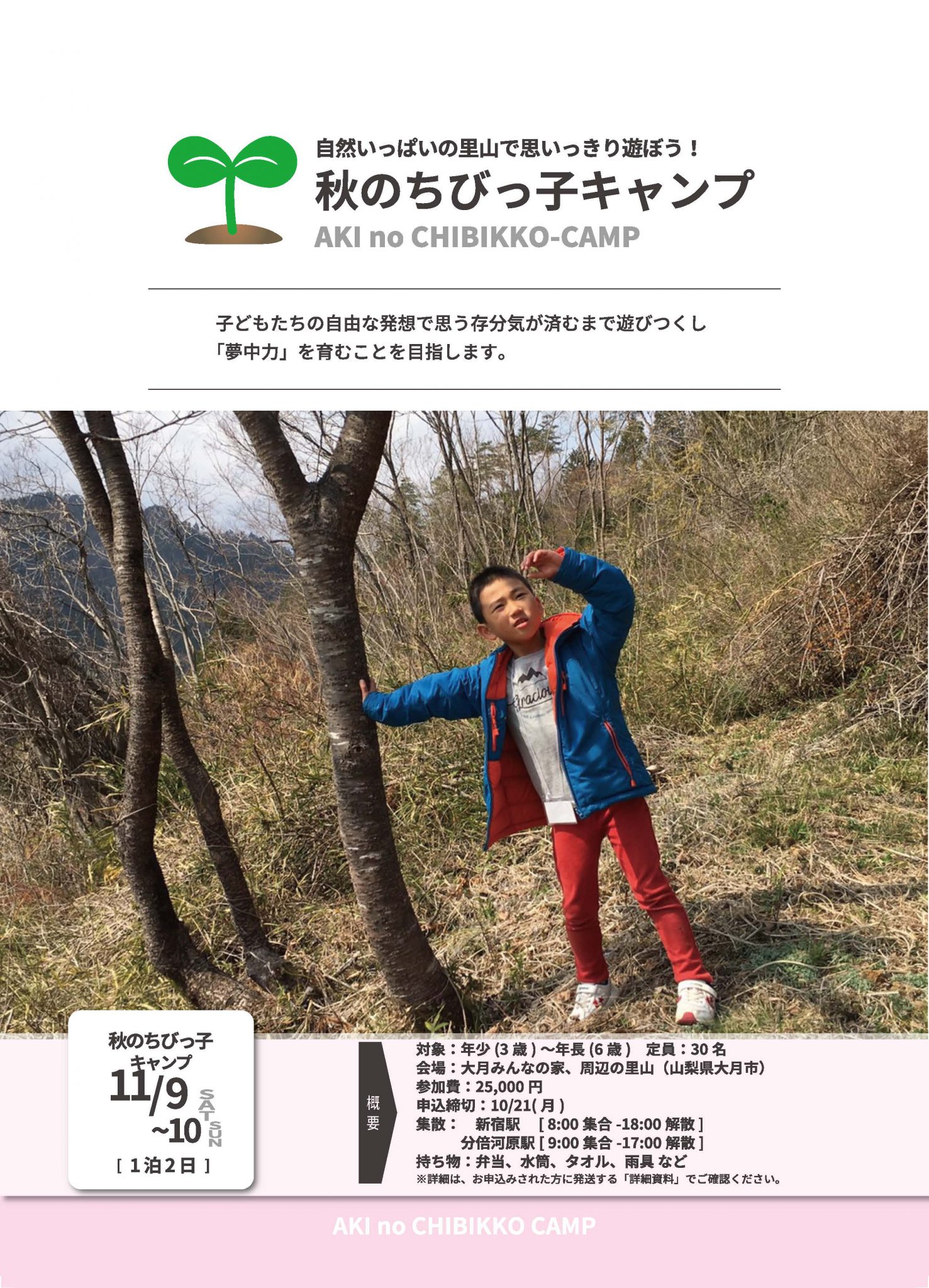 参加申し込みいただいた皆様には次回12月7日(土)実施の「おおつき森のようちえん」への振替、11月9日(土)-10(日)実施「秋のちびっ子キャンプ」への振替を承っております。