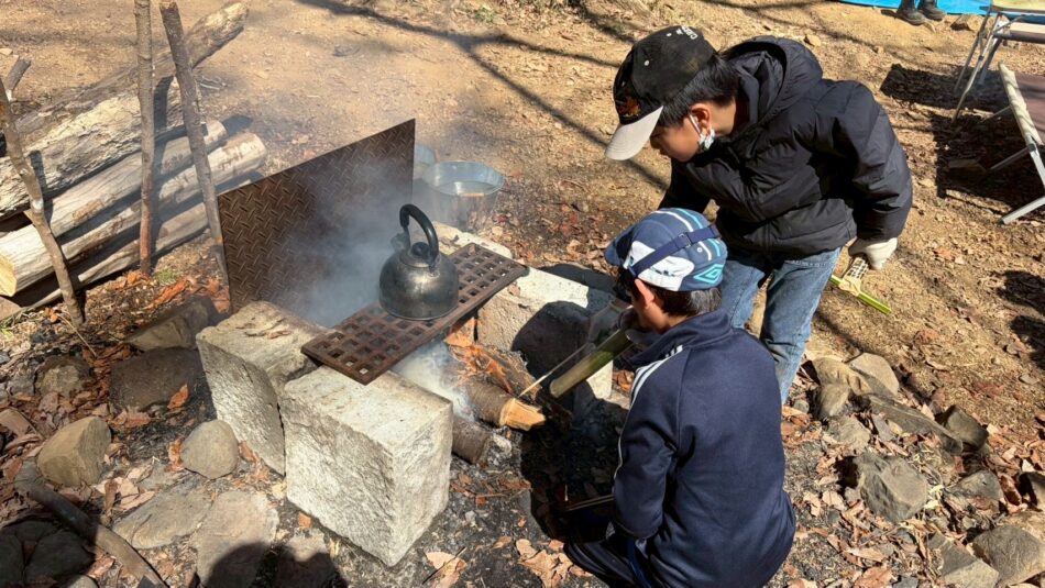 たき火ブースでは「どうしたら上手に火がつくのか!?」をリーダーと一緒に考えながら実践していて、イベント終了時までずーっと火が消えずにいました!