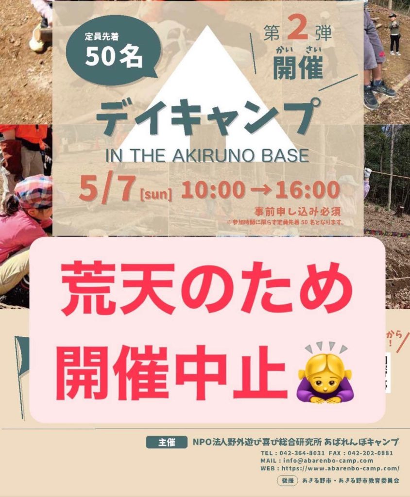 明日開催予定でした「第2回AKIRUNO BASEデイキャンプ」ですが、荒天予報が出ているため開催中止とさせていただきました。