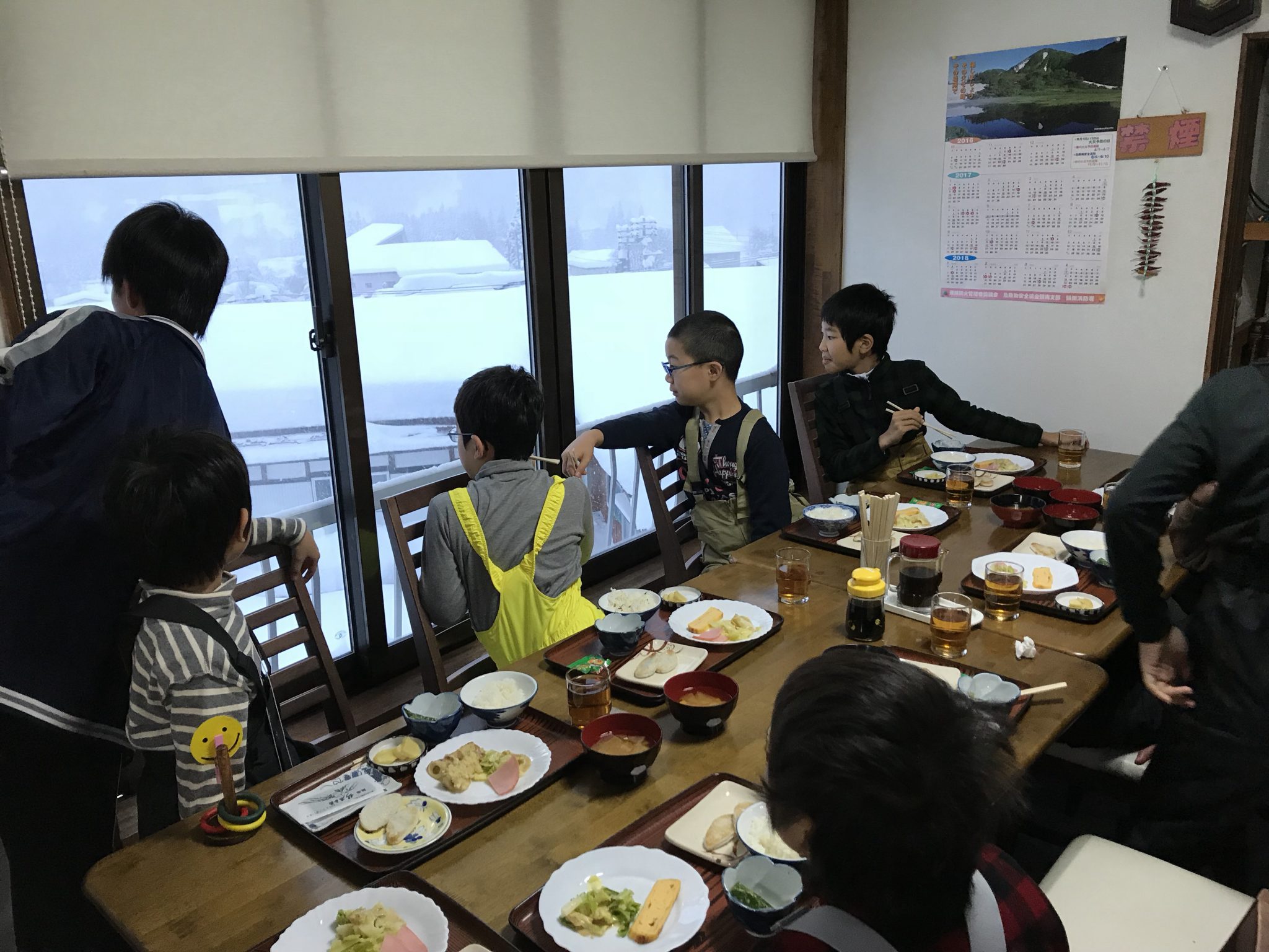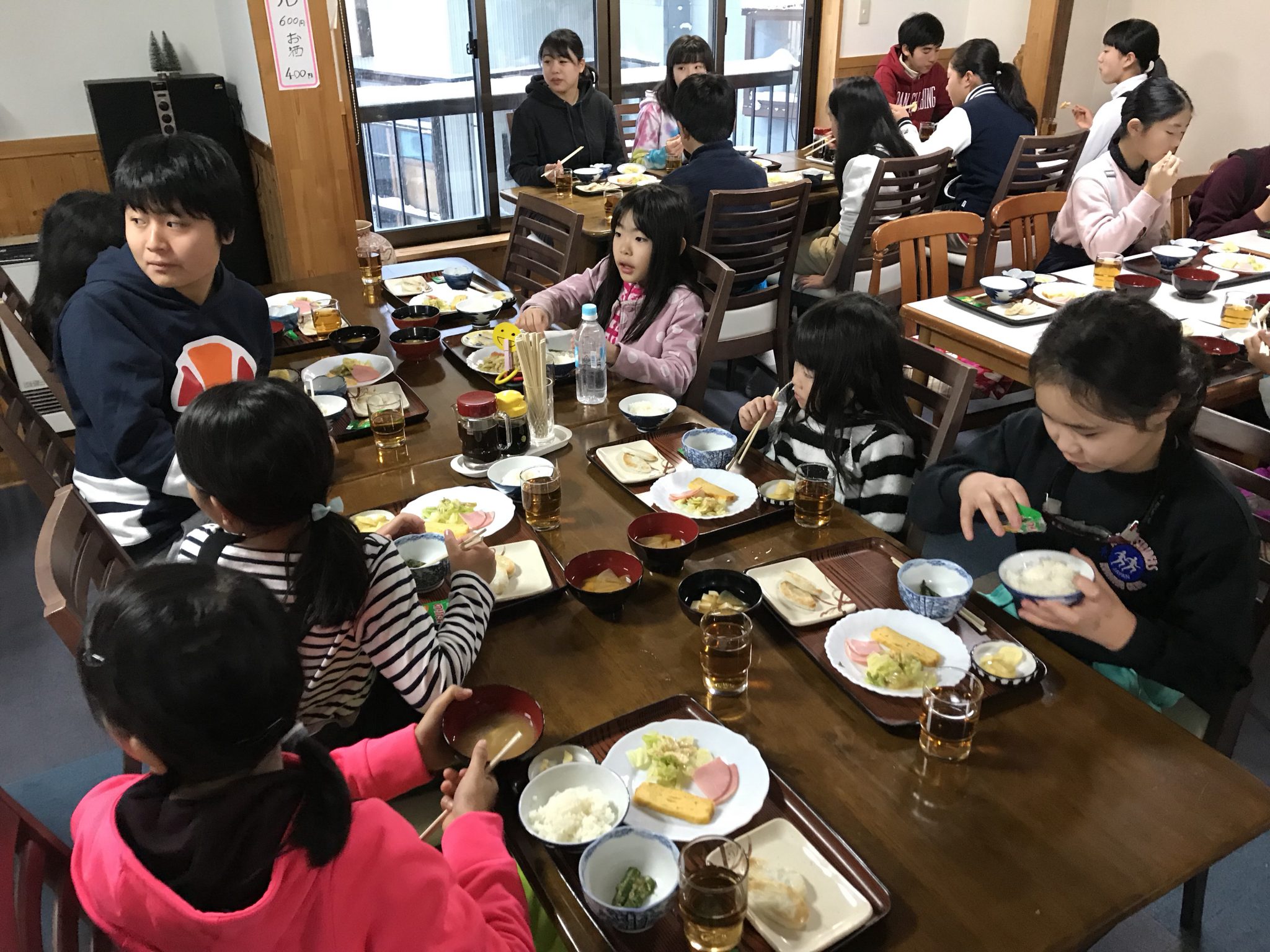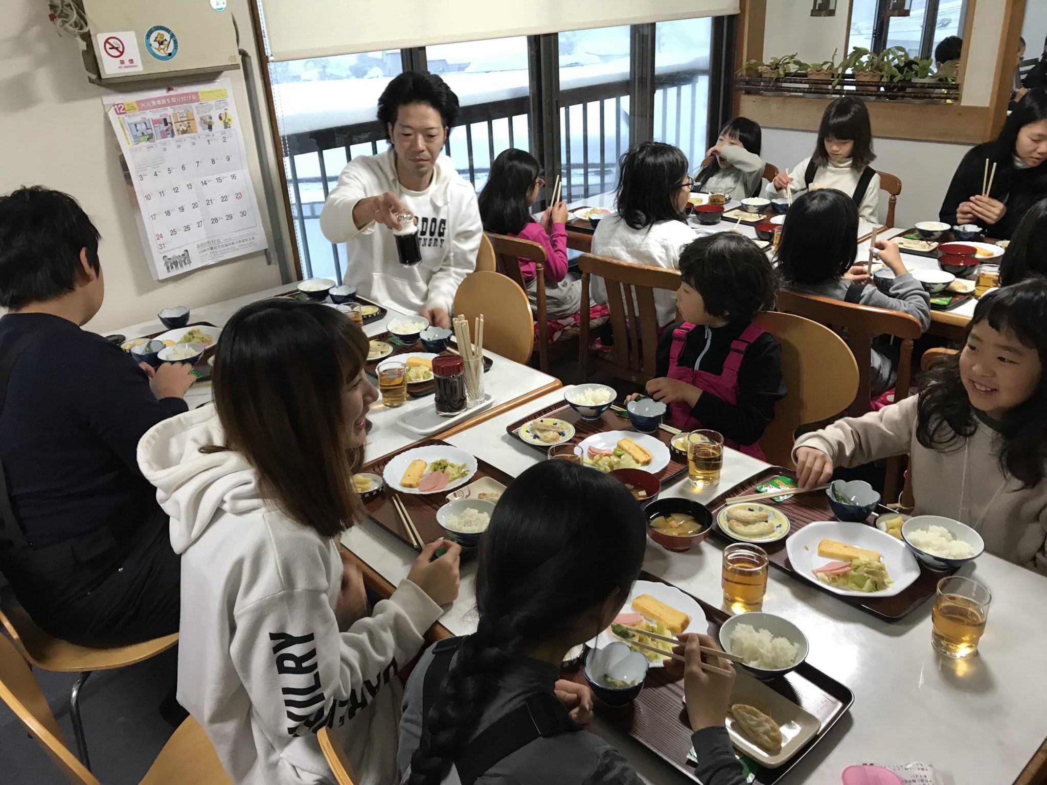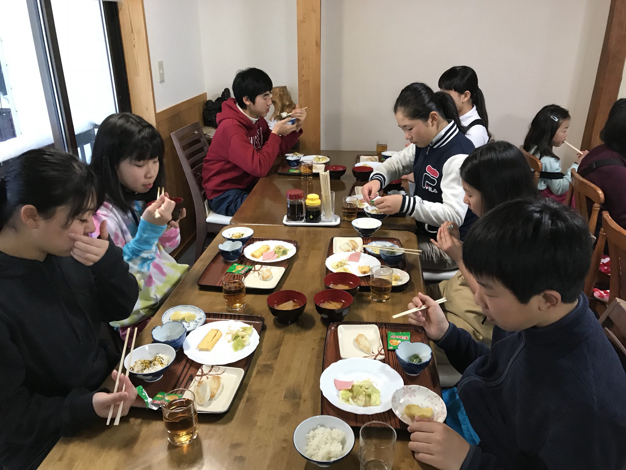 スキー教室メンバーは6時に起床し、布団たたみ、着替えを済ませて朝ごはんを食べてます。 この後のスキーのためにおかわりもたくさんしています。
