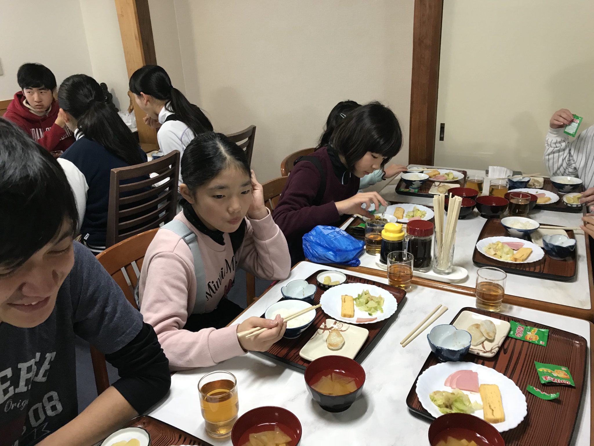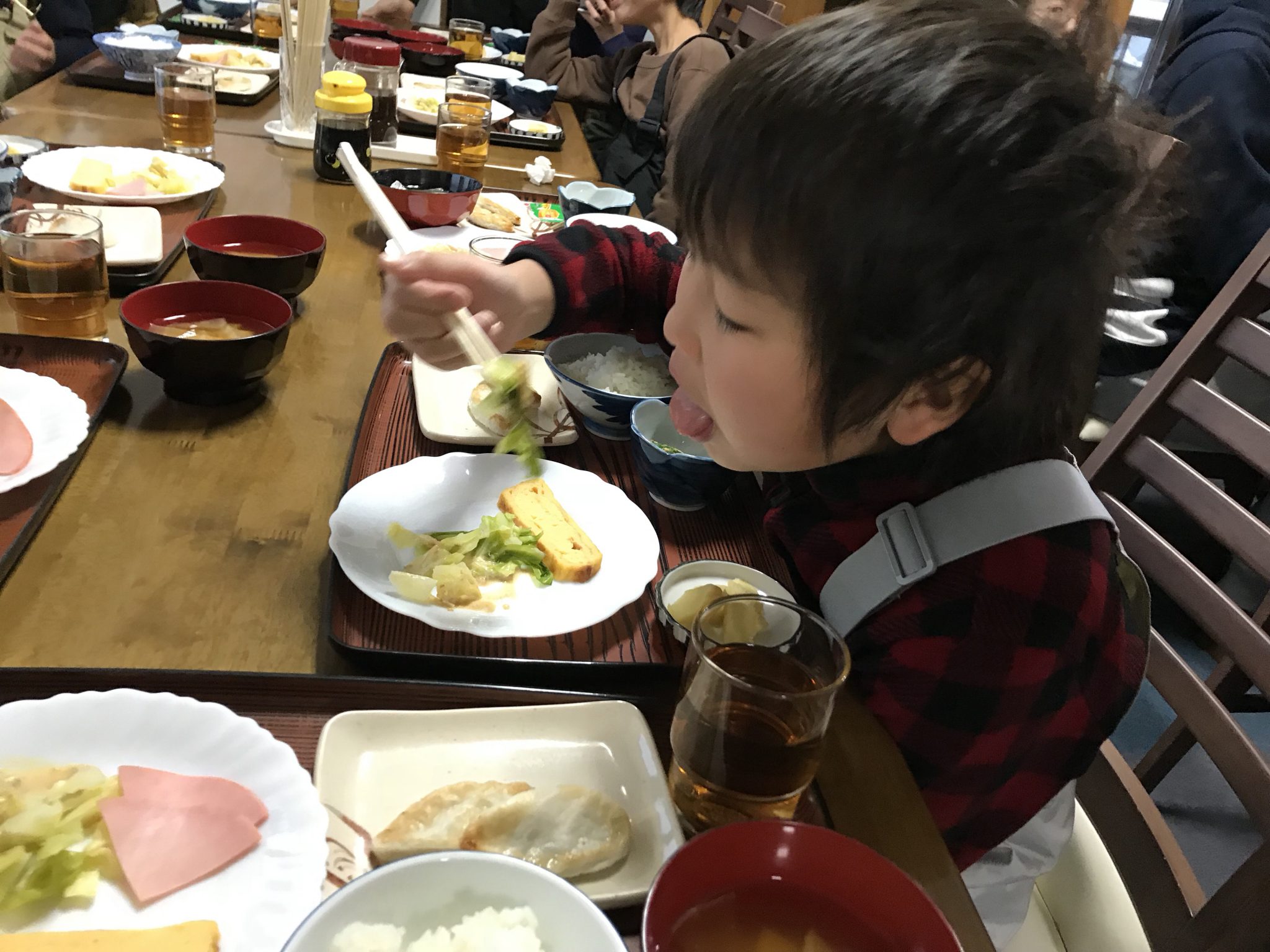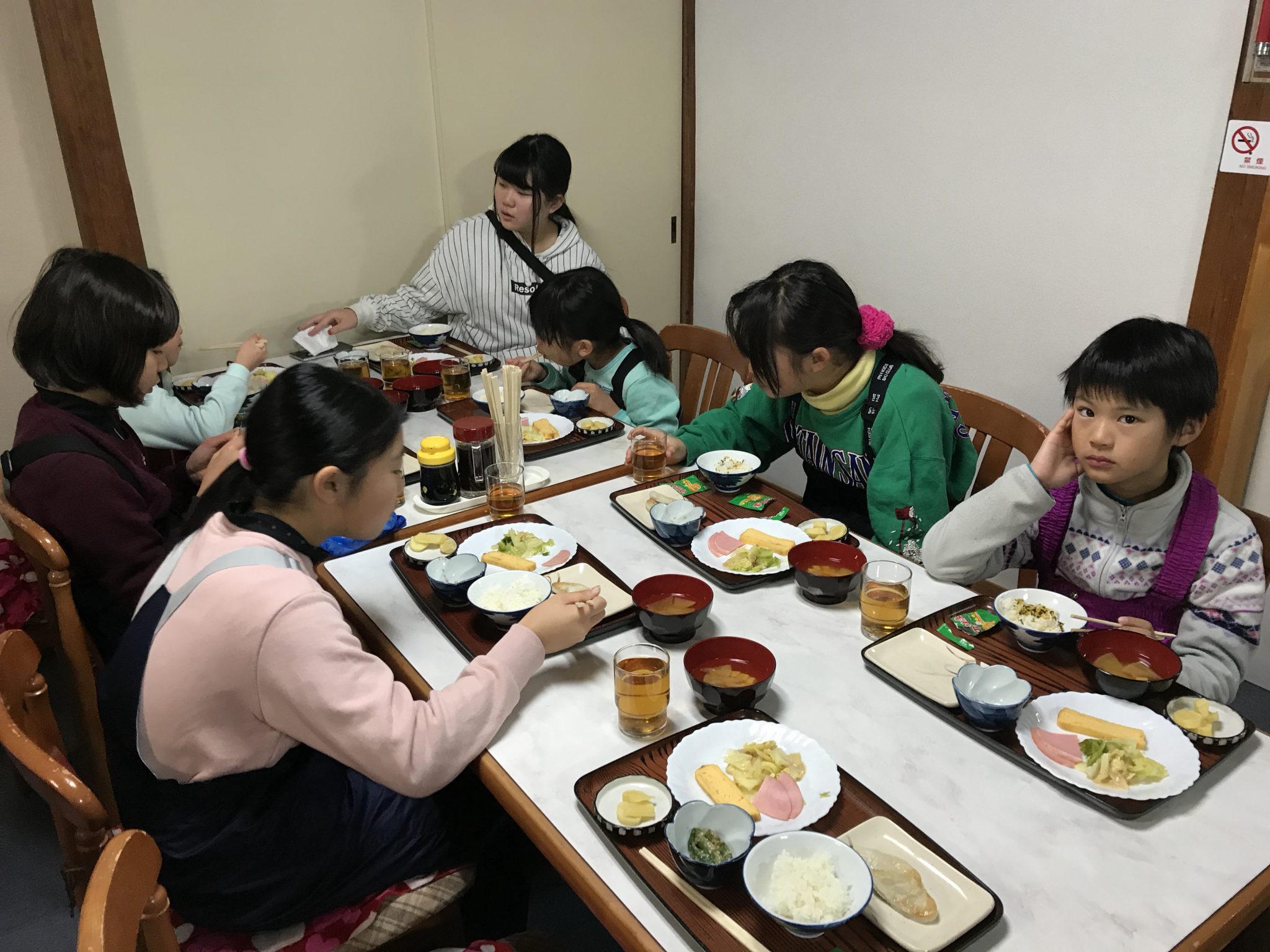 スキー教室メンバーは6時に起床し、布団たたみ、着替えを済ませて朝ごはんを食べてます。 この後のスキーのためにおかわりもたくさんしています。