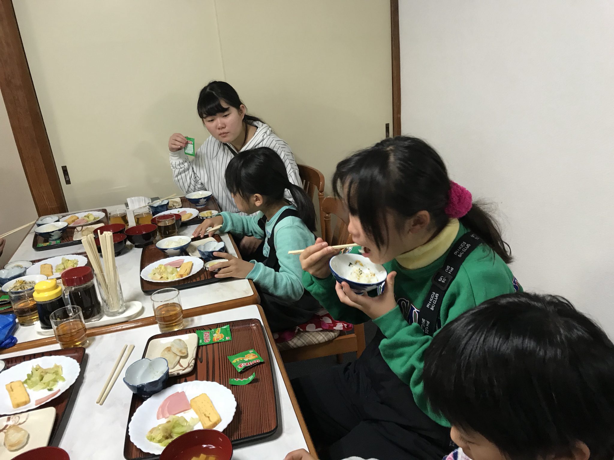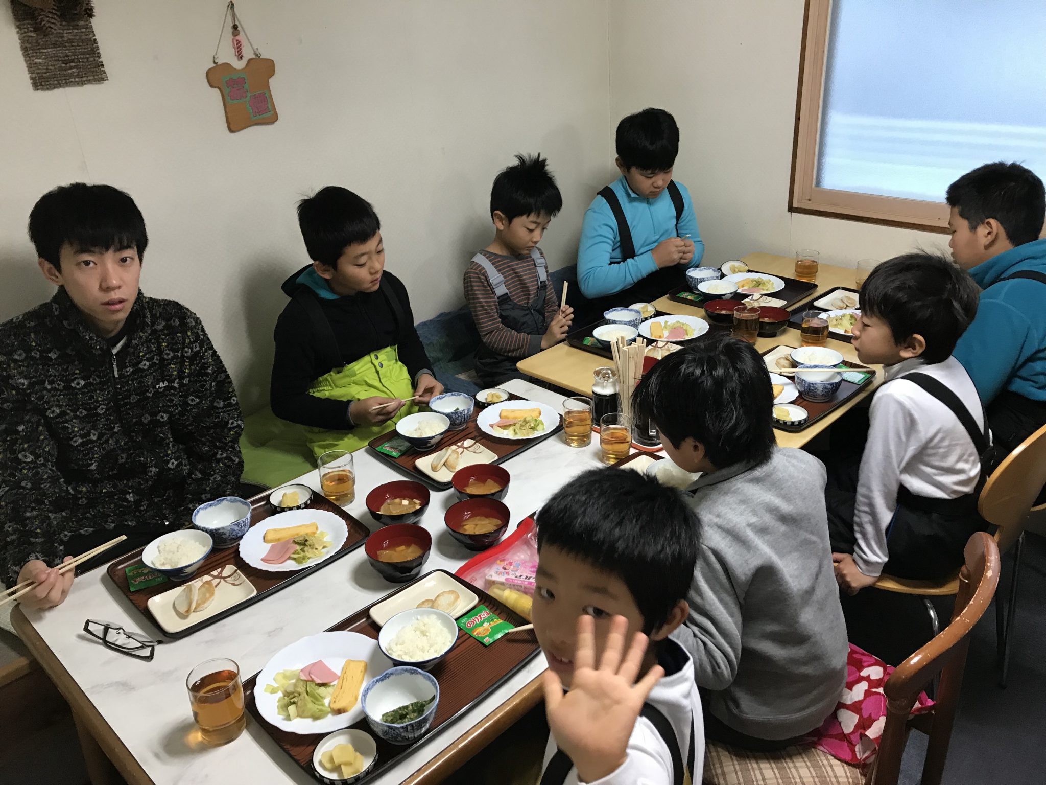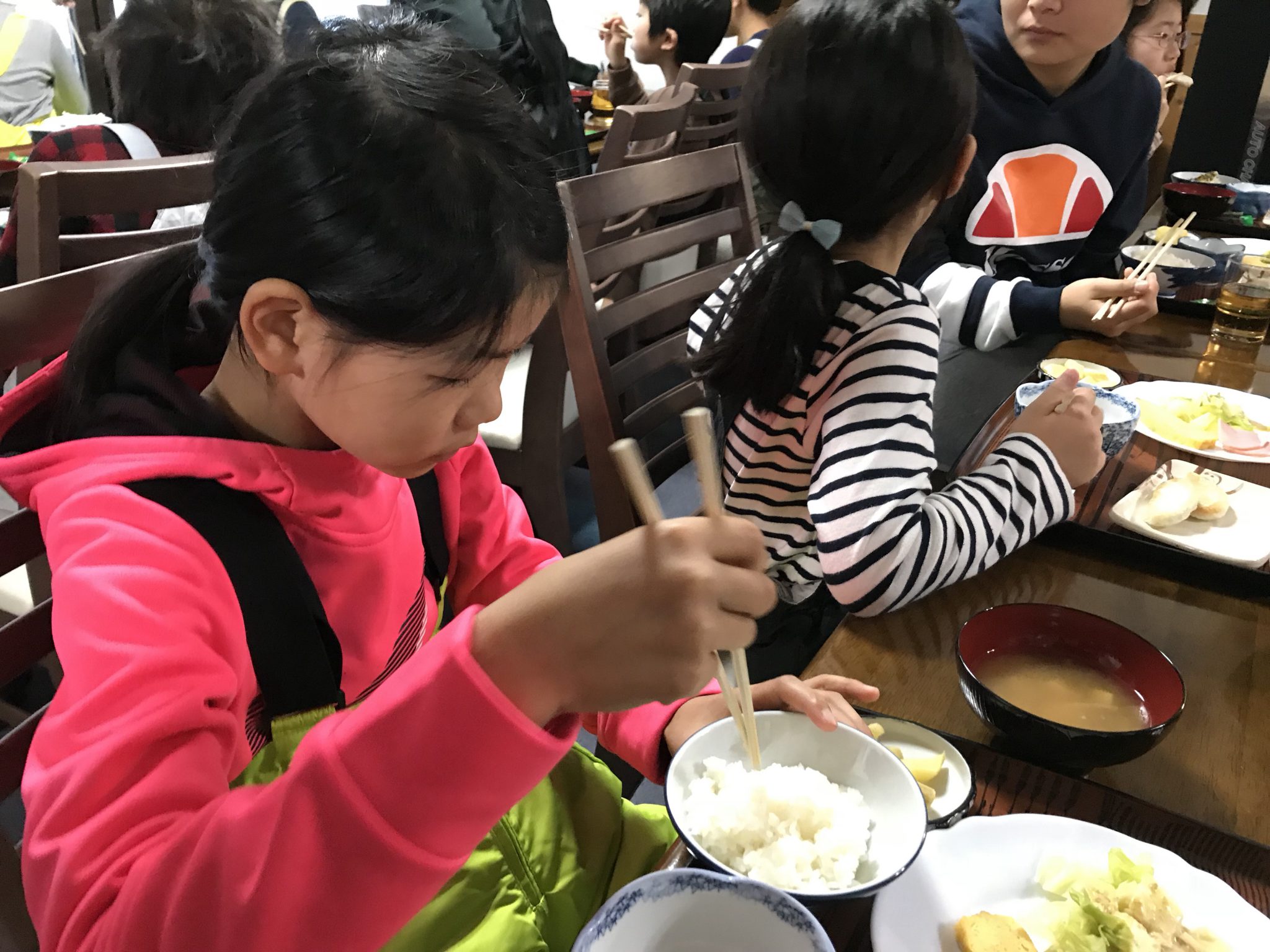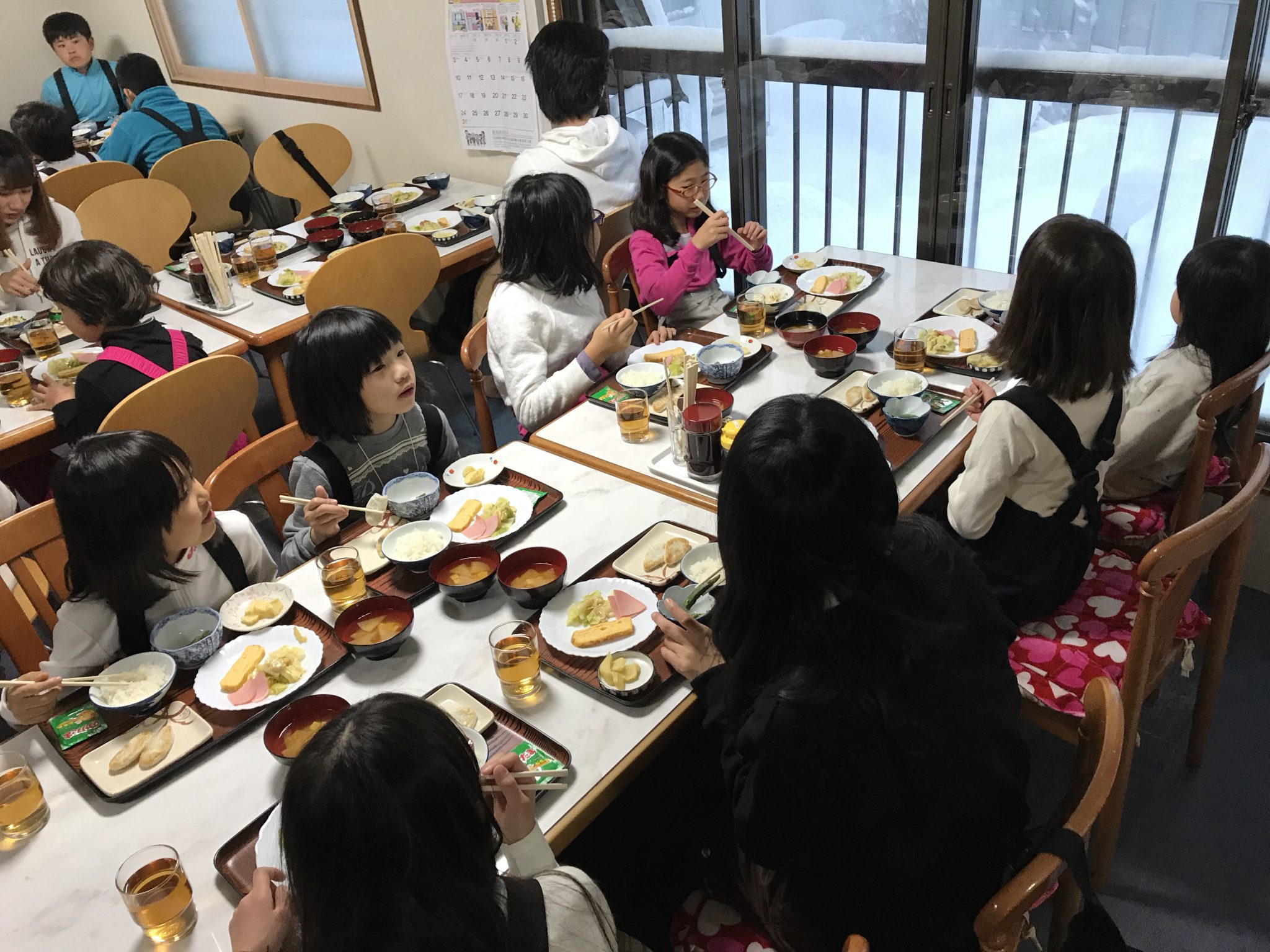 スキー教室メンバーは6時に起床し、布団たたみ、着替えを済ませて朝ごはんを食べてます。 この後のスキーのためにおかわりもたくさんしています。