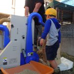 機械からもみ殻が吹き出る様子に子ども達は興味深々。積もったもみ殻を集めたり、バケツやビニール袋を吹き出し口に添えて溜めてみたり・・・もみ殻の感触を楽しみながら遊びがどんどん広がっていきました。